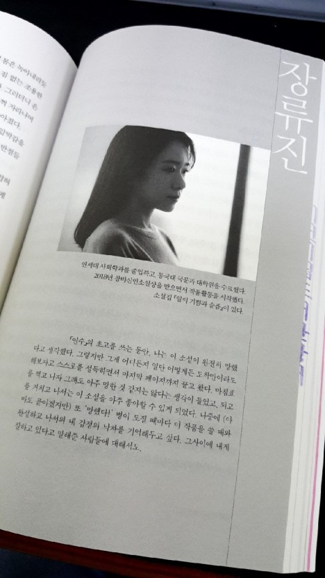 장류진(1986 - )작가는 연세대학교 사회학과를 졸업하고 동국대학교 대학원 국문학을 수료했다. 7년간 IT회사에서 일한 경력이 있고 2018년 소설 ‘일의 기쁨과 슬픔’ 으로 제21회 창비신인소설상을 받으며 등단했다. 수상경력으로는 2020년 제11회 젊은 작가상을 비롯, 심훈 문학상 등의 수상경력이 있다.
