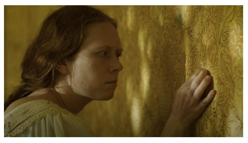 결국 나는 누워서 벽지를 보는 일 외에는 할 일이 없다. 하루 종일 벽지만 보고 있는 거다. 그러다 보니 이상한 느낌이 든다. 처음에는 디자인이 좀 이상한 벽지라고 생각했지만 점차 그 벽지에서 기괴한 것을 발견하게 된다. 벽지의 바깥 무늬 안쪽에서 어떤 여자가 구부정하게 기어다니는 것 같다는 생각이 드는 것이다. 밤에 방 안에 달 빛이 비출 때는 벽지 무늬가 움직이는 것처럼 보이고 점점 두려운 느낌이 강해지자 남편에게 별장을 떠나 집으로 가고 싶다고 말을 하나 남편은 별장 계약 기간이 3주나 남았다며 나의 말을듣지 않는다.