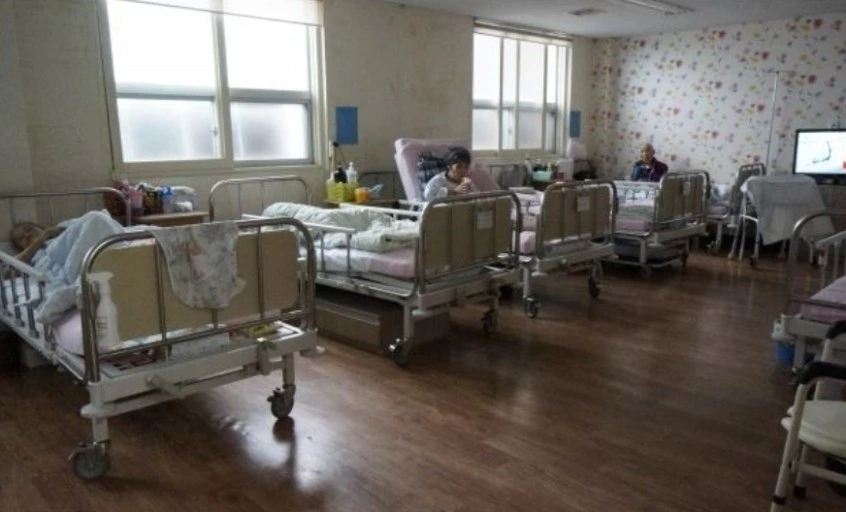 배경 360도 회전하며 해피타운 7호실에 밤이 찾아오고 세 명의 노인이 침상에 나란히 누워있다
