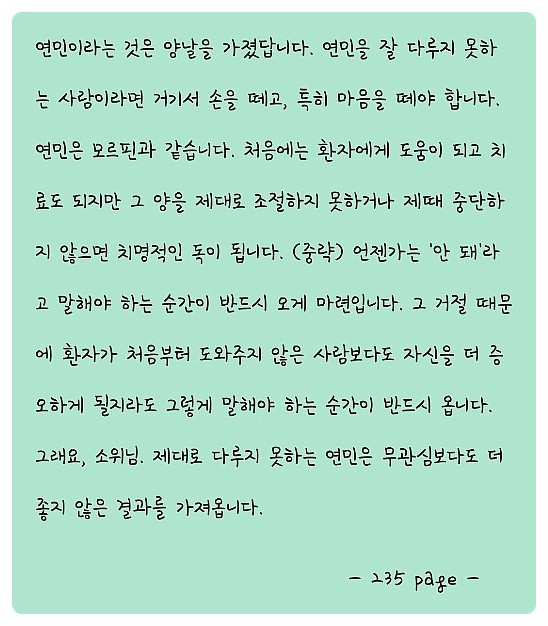우리는 호프밀러에게 진정한 연민을 행하는 자가 되지 못했느냐고 절대 비판할 수 없으며 에디트에게 왜 호프밀러를 사랑했냐고 나무랄 수 없다. 설 익은 감정, 감당하지 못할 연민을 남발하는 호프밀러와 호프밀러의 사랑을 갈구하는 에디트도 이기심을 보면서 연민과 사랑은 완전히 다른 종류의 감정이며 정확히 구분 하여 사용하지 않으면 모두가 불행해 진다는 사실을 명확하게 깨달아야한다.