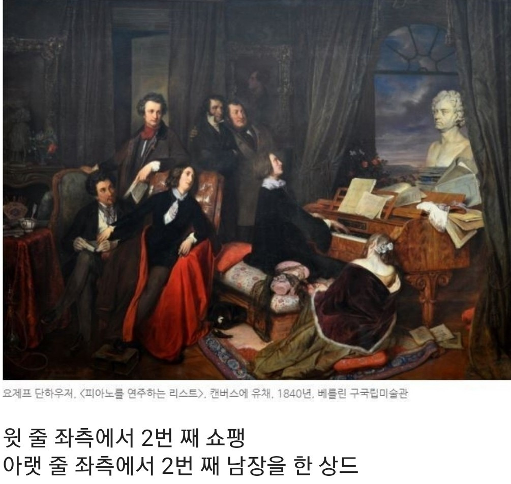 조르주 상드(1804-1876), 본명은 '오로르 뒤팽'이다. 프랑스 낭만주의 시대의 대표적 여성작가로 프랑스의 베리 주(州) 노앙에서 할머니 손에서 자랐으며, 16세 경 지방의 귀족인 뒤드방 남작과 결혼하였으나 행복한 결혼생활은 오래 유지되지 못하고 두 아이를 데리고 집을 나와 파리로 옮겼다. 신문소설 '앵디아나 Indiana'(1832)를 써서 유명해졌다. 남장을 하고 길에서 줄담배를 피우며 지나가는 등 여성의 권리를 부르짖던 여성 해방의 선각자로도 유명했고 자유 연애자로도 유명했으며 평생 숱한 애인이 있었다고 하는데 특히, 여러 문인, 예술가들과 교제를 했고 그중에서 6세 연하의 시인 뮈세, 음악가 쇼팽 등과이 연애 사건이 유명하고 이러한 상드의 행태를 두고 보들레르는 ‘매춘부’, ‘공중변소’라고 비판하기도 했다. 상드의 연애사 중 하나를 예를 들어보자면 피아노의 시인이라고 불리는 (1810 ~ 1849)쇼팽이 1832년 첫 연주회를 마치고 파리 사교계에 발을 들여놓았고, 보진스카라는 여인과 약혼까지 했으나 결핵으로 인해 파혼을 하게 된다. 그 후 귀족 부인이 주최한 파티에서 조르주 상드를 만나게 되는데 6년 연상의 상드는 먼저 쇼팽에게 먼저 고백을 하였고 약 9년의 열정적인 사랑을 나누었으며 1846년 쇼팽의 그의 지병(결핵) 악화와 불화로 헤어졌다고 한다.