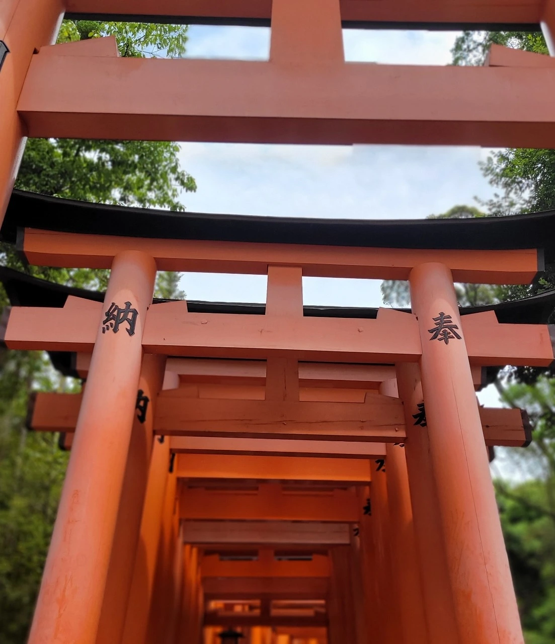 저기 첫번째 도리이가 나타난다. 빨간 기둥이 시작되는 모습을 보니 여기서부터 신성한 영역이 시작되는건가. 경건한 마음으로 발걸음을 옮긴다. 신사 입구를 기준으로 중간부터 엄청 많아 보이는 도리이들이 눈에 띤다. 사업번창등을 위해 대기업과 자영업자들이 봉헌했다는 천개의 도리이가 시작이 되었다.