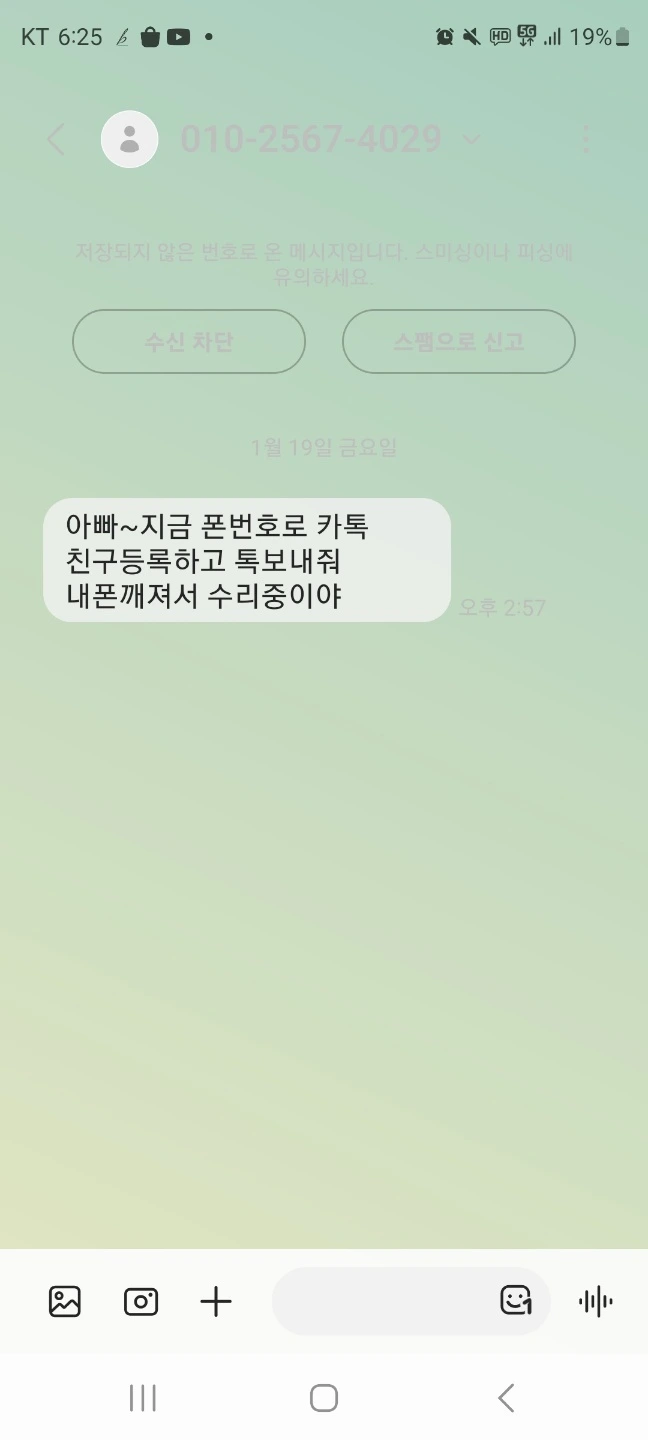 우리가 사는 세상에도 바닥에 달라붙은 껌같은 인간 들이 있다. 얼마전 큰 아이에게 카카오톡이왔다. 폰이 깨져서 수리 중이니 지금 보낸 폰 번호로 친구등록하고 톡을 보내달라는 내용이다. 참 세상천지에 큰 놈이 내게 톡을 먼저하다니 이건 1년에 한 번 있을까 말까한 대사건이다. 하도 안하던 짓을 하여 아이의 원래 번호로 톡을 보내 보니 '헐 진짜 저렇게 오네'라고 하며 자기가 보낸 톡이 아니라고 하여 이내 보이스피싱임을 알아채고 즉시 톡을 삭제하였다.