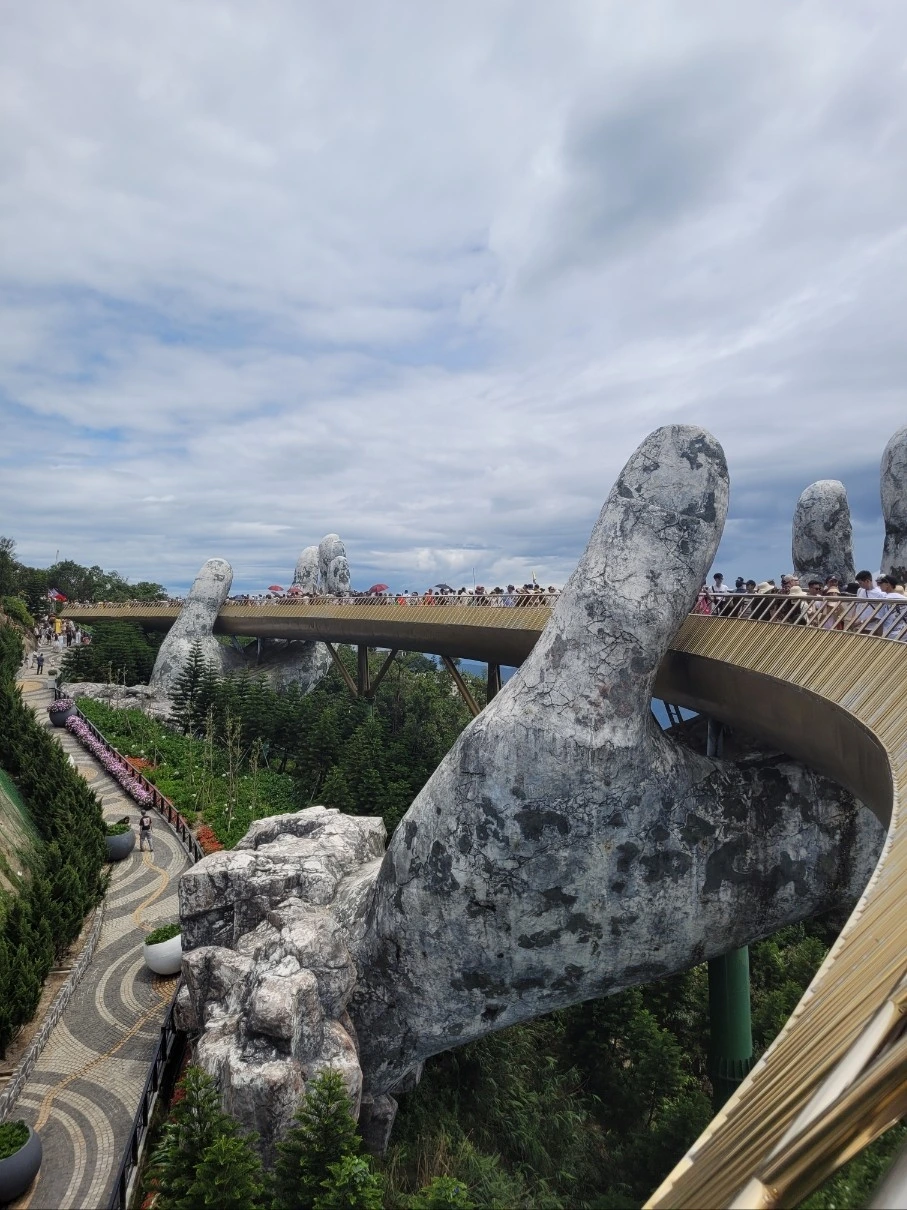 오늘은 말로만 듣던 다낭의 명소 바나힐 테마파크를 간다. 먼저 다낭에가면 필수적으로 꼭 가봐야하는 골든 브릿지, 세계에서 두번 째로 길다고 하는 케이블카를 타고 가는데 풍경이 압권이다. 유리창 너머로 울창한 삼림과 바위를 타고 흐르는 계곡수가 보기만해도 시원하다. 드디어 골든 브릿지에 도착, 골든브릿지는 양 손이 다리를 받치고 있는 형상이다. 길이는 약 150m,너비는 약 12.8m라고 하는데 막상 앞에서보니 어마어마하다. 골든 브릿지는 황금 다리를 잡고 있는 신의 손을 형상화 했다고 하는데 처음엔 재잴이 시멘트 인줄 알았는데 더 튼튼한 유리섬유와 금속으로 만들어졌다고 한다. 다리 위에서 보는 풍경이 끝내준다. 다낭이 자랑할만 한 명승지다.
