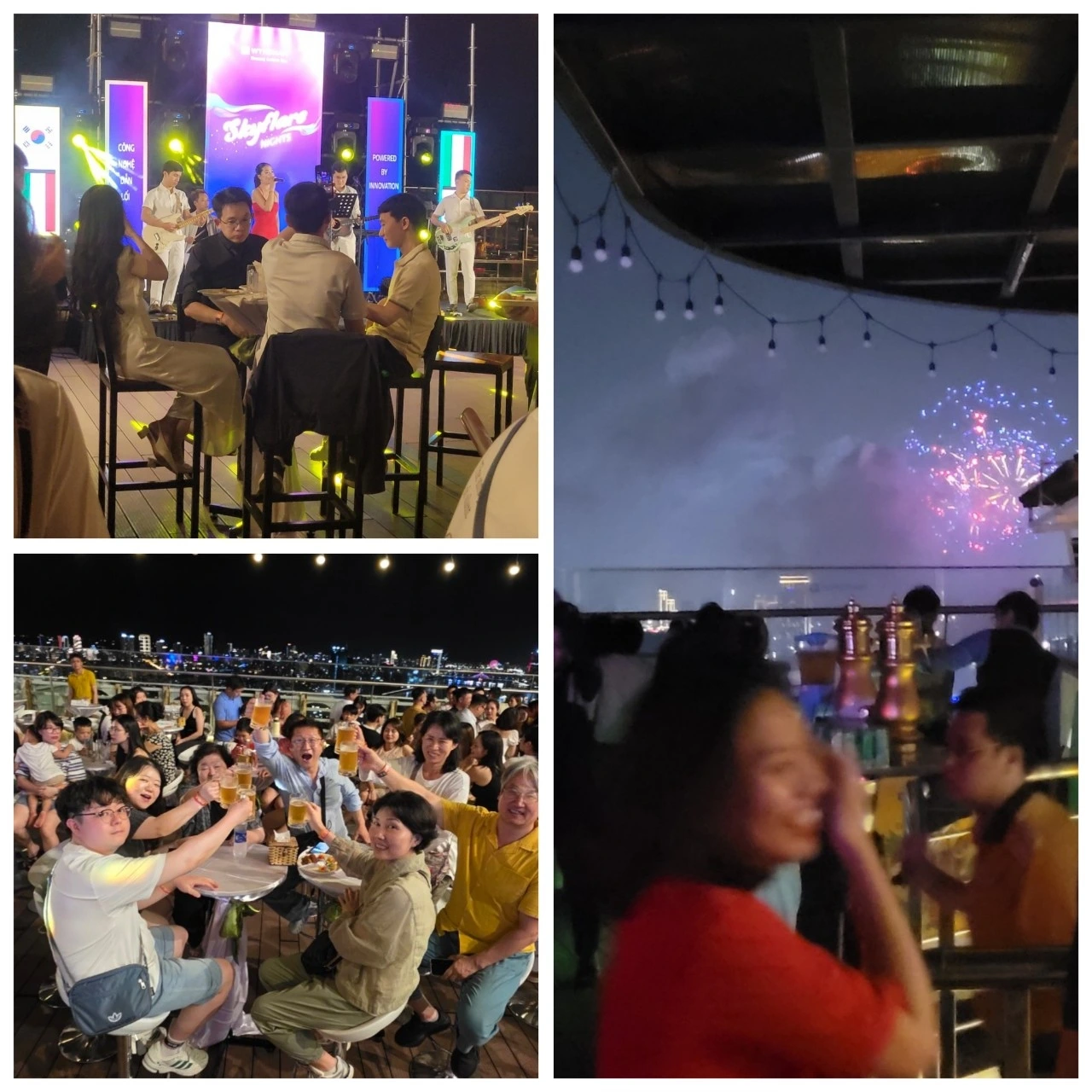 다음은 다낭 롯데마트에가서 직원들 줄 베트남 캔맥주 등 주류를 좀 사고 루프탑에서 맥주를 마시며 불꽃축제를 구경한다. 관광객뿐만아니라 베트남 사람 들까지 인산인해를 이루었고 더위와 습기가 날 괴롭힌다. 루프탑에가서 노래를 들으며 가볍게 맥주 한 잔, 우리 팀7명이 사진 한 컷 했다. 불꽃놀이는 언제 시작될지 모르고 사람은 미어터지고 그러나 언제 또 다낭의 이런 분위기를 즐겨보겠나 인생은 길고 긴 여행이고 여행은 인생의 한 부분이다. 훗날에 오늘이 추억의 한 컷이 될터 모든 것이 감사하고 행복하다. 불꽃쇼를 보던 중 역시 변덕스런 다낭 날씨답게 갑자기 비가 후두둑 떨어진다. 재빨리 자리를 파하고 호텔로 돌아간다.