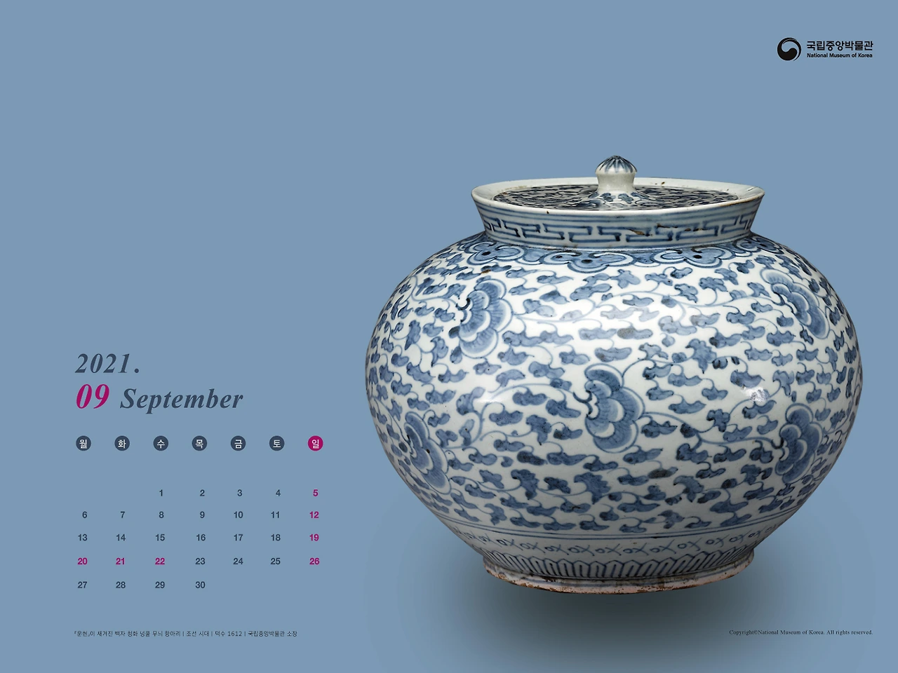 컴퓨터 바탕화면 바꾸기! 국립중앙박물관에서는 매달 첫 번째 주에 바탕화면용으로 ‘매월의 달력’을 배포하는데 2021년 9월에는 ‘『운현』이 새겨진 백자 청화 넝쿨무늬 항아리’이다. 귀한 예술품을 보면서 마음이 정갈해진다.