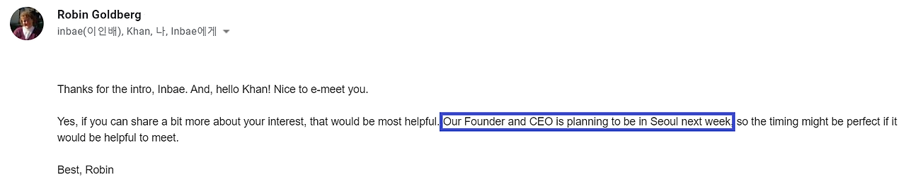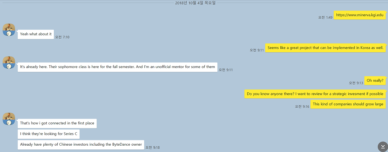"Ben, after having a conversation with you for long, I have an unreasoned or yet unexamined feeling that Minerva could go really, really, large with the greatest impact in the field at the level we've never seen before. Korean students should have the equal chance, and I wanna make sure they do. So, let me have the chance to participate in the round you will be creating for us."