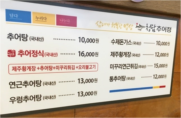 <청담추어정>의 메뉴 보드를 살펴보면 추어탕과 추어 정식, 그리고 그 밖의 단품으로 메뉴 구성이 되어있다. 추어탕이 1만 원, 추어 정식은 1만 6000원인데, 추어 정식에는 제주황게장과 미꾸리연근튀김의 단품은 물론 오리불고기까지 제공된다. 6000원만 더 내면 다양한 메뉴를 맛볼 수 있는 셈이다. 고객 입장에서는 다양한 메뉴를 푸짐하게 먹을 수 있어 6000원을 추가로 더 내는 게 부담스럽게 느껴지지 않는다. 매장 입장에서도 객단가가 오르는 것은 물론, 식재료 회전율까지 올라가니 운영 효율성을 확보할 수가 있다. 실제로 매장 내 고객들은 대부분 추어정식을 선택하고 있었다.