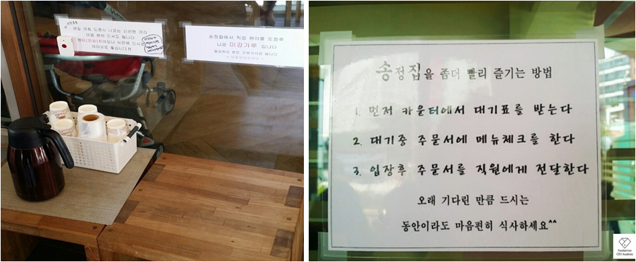 송정 집 대기공간에는 메뉴판과 고객 주문서가 비치되어 있다. 고객이 대기 중에 미리 주문서를 작성한 뒤 입장 시 직원에게 주문서를 전달하도록 프로세스가 설계되어 있다. ‘송정집을 좀 더 빨리 즐기는 방법’이란 주제로 고객을 참여시키고 있다. 이는 고객에게 소일거리를 제공하여 심리적 대기시간을 줄이고, 미리 주문서를 작성하게 함으로써 대기 중에도 이미 구매가 시작된 것으로 인식하게 만들고 있다. 마이스터의 첫 번째, 두 번째, 세 번째, 네 번째 원칙을 모두 조치한 사례로 볼 수 있다.