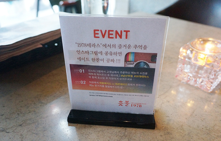 아무리 공짜가 좋다지만 고객에게 아무런 대가를 주지 않는다면 우리 매장이 홍보되는 횟수가 크게 늘지 않을 것입니다. 이럴 땐 고객이 수고한 만큼 대가를 지불하는 것이 필요합니다. 서울 남산 근처에 있는 이탈리안 레스토랑 1978 테라스는 고객이 인스타그램에 체크인 후 해시태그로 #남산맛집 #1978테라스 등으로 사진을 올리면 확인 후 에이드 한 잔을 주는 이벤트를 하고있습니다. 별 생각 없다가도 이 내용을 보면 자연스럽게 인스타그램에 사진을 올리게 됩니다. 아무래도 사진이 올라가는 횟수가 더 많아질 터. 더 많은 고객에게 노출이 되고, 사진을 본 고객들의 방문으로 이어지면 매출 또한 오르는 구조입니다.