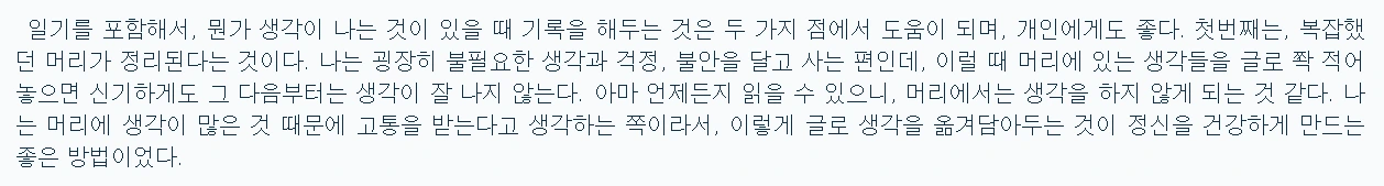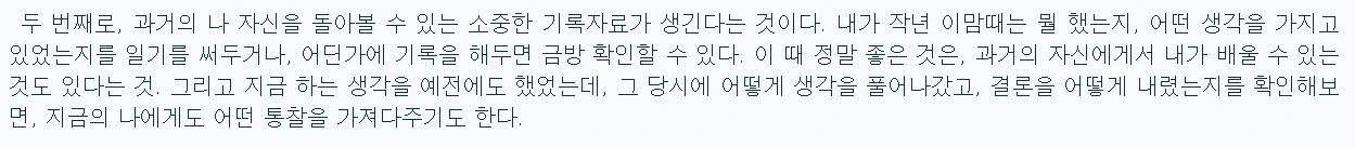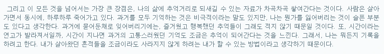 일기 쓰기의 또 다른 장점은, 일기를 읽는 것만으로도 많은 것들이 다시금 떠올릴 수 있게 된다는 것입니다.