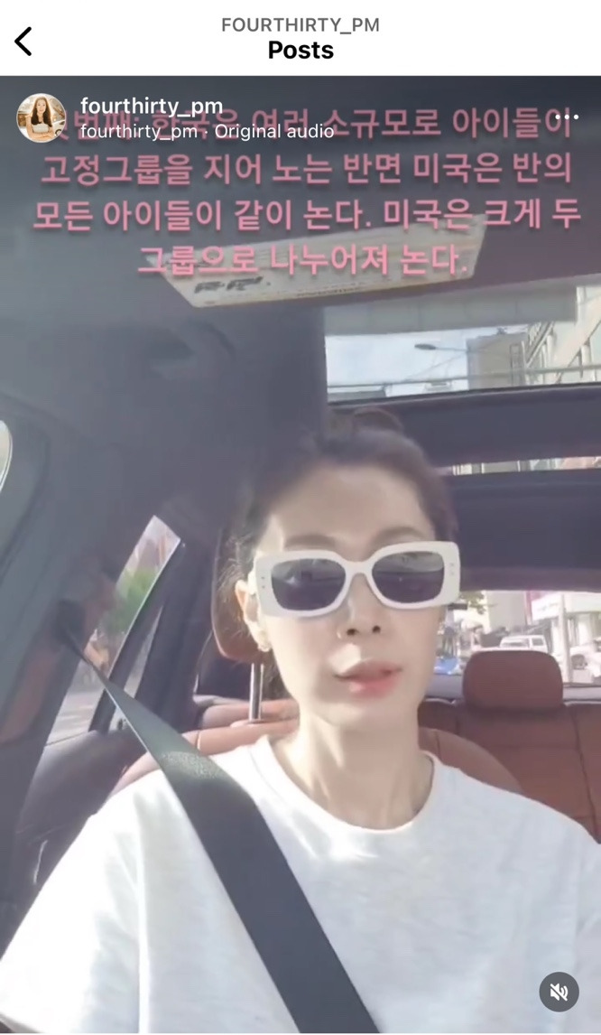 이것이 제 눈에만 보이는 차이일까 궁금한 시기도 있었습니다. 모두의 경험이 같을 수 없고, 지나온 길에 따라 보는 시각이 다를 수도 있으니까요. 그러나, 후에 해외에서 귀국하며 새롭게 전학 온 아이들의 어머니들이 비슷한 고민을 털어놓으시는 것을 보며 이것이 전반적으로 비슷하게 느끼고 보는 특징이라는 점을 알 수 있었어요. 특히 아시아 권에서 귀국을 한 경우 (또는 한인 커뮤니티가 큰 지역)보다는, 미주권이나 유럽에서 귀국을 한 경우 이런 차이를 느끼는 부모님의 이야기를 들을 수 있었습니다. 얼마 전에는 인스타그램에서 @fourthirty_pm 님이 미국에서 한국으로 귀국 후 국제학교에 재학 중인 딸과의 짧은 인터뷰를 통해서 한국학교와 미국 학교의 차이를 설명하는 영상을 보다가 고개를 끄덕끄덕 하게 되었는데요, 실제 학교를 다니는 아이의 입장에서 미국학교와 한국 학교의 차이 중, 첫 번째로 언급 한 내용이 "한국은 여러 소규모로 아이들이 고정 그룹을 지어 노는 반면 미국은 반의 모든 아이들이 같이 논다. 미국은 크게 두 그룹으로 나누어져 논다."라는 것이었어요. 신기하죠?