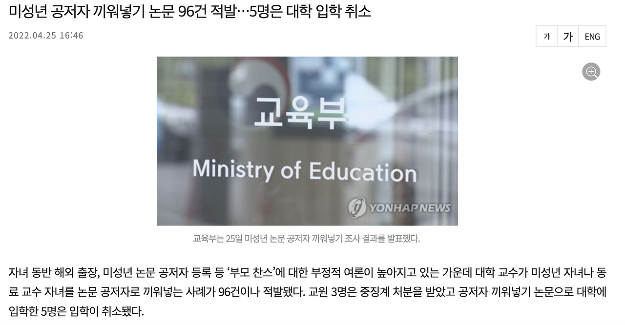 이 조사 결과, 96건이 ‘부당한 저자 등재’로 판정되었고, 고등학생들이 SCI급 국제 학술지 논문에 실질적 기여 없이 이름을 올린 사실이 확인되었습니다. 심지어 이들 중 상당수는 해당 논문을 입시 서류로 제출해 서울대, 연세대 등 주요 대학에 합격했다고 해요. (각주참조) 이 결과에 집중적으로 기자들의 취재가 시작되자, 다양한 사례들이 물 위로 떠올랐죠.