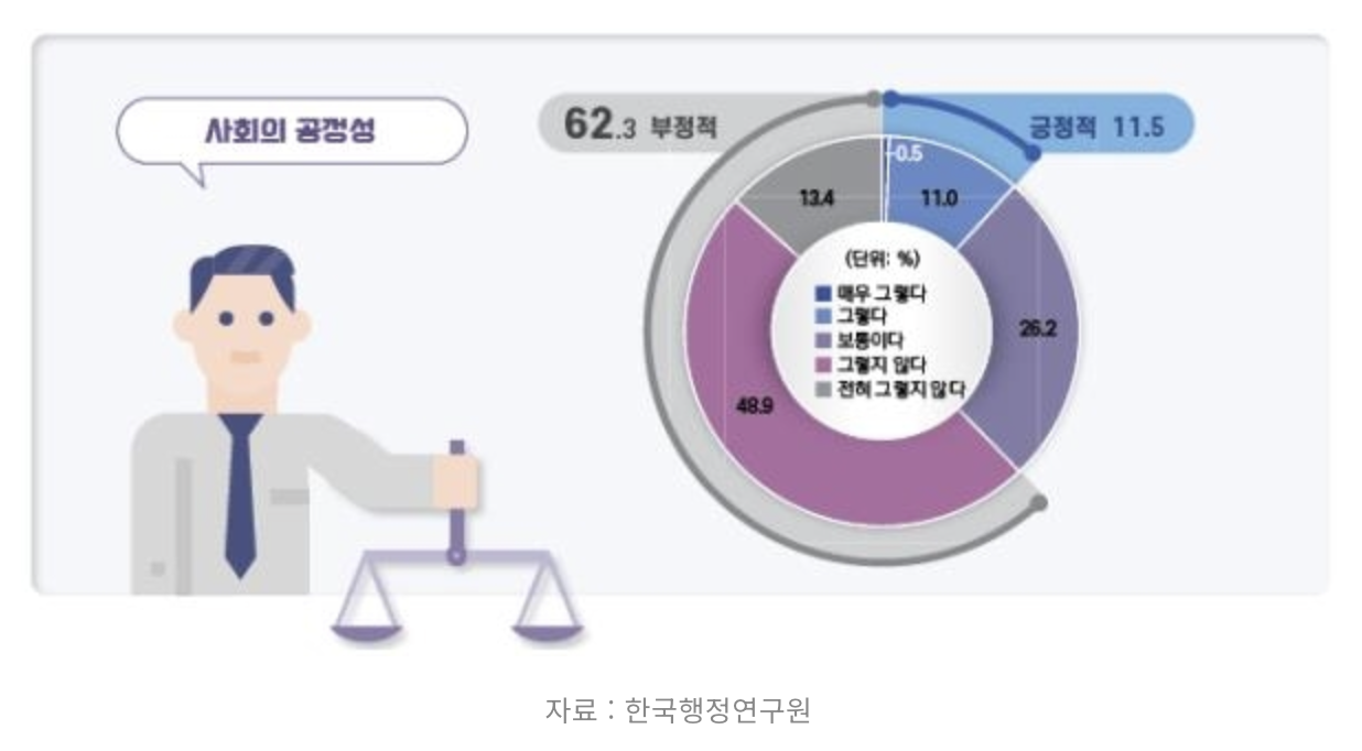 2023년 한국행정연구원 조사에 따르면, 우리 국민 10명 중 단 한 명만이 “한국 사회는 공정하다”라고 답했고, 무려 62%는 정반대로 “공정하지 않다”라고 느끼고 있다고 해요. 특히 수도권에 사는 시민의 72.6%, 그리고 2030 세대의 65%는 “이 사회는 불공정하다”는 인식을 공유하고 있습니다.