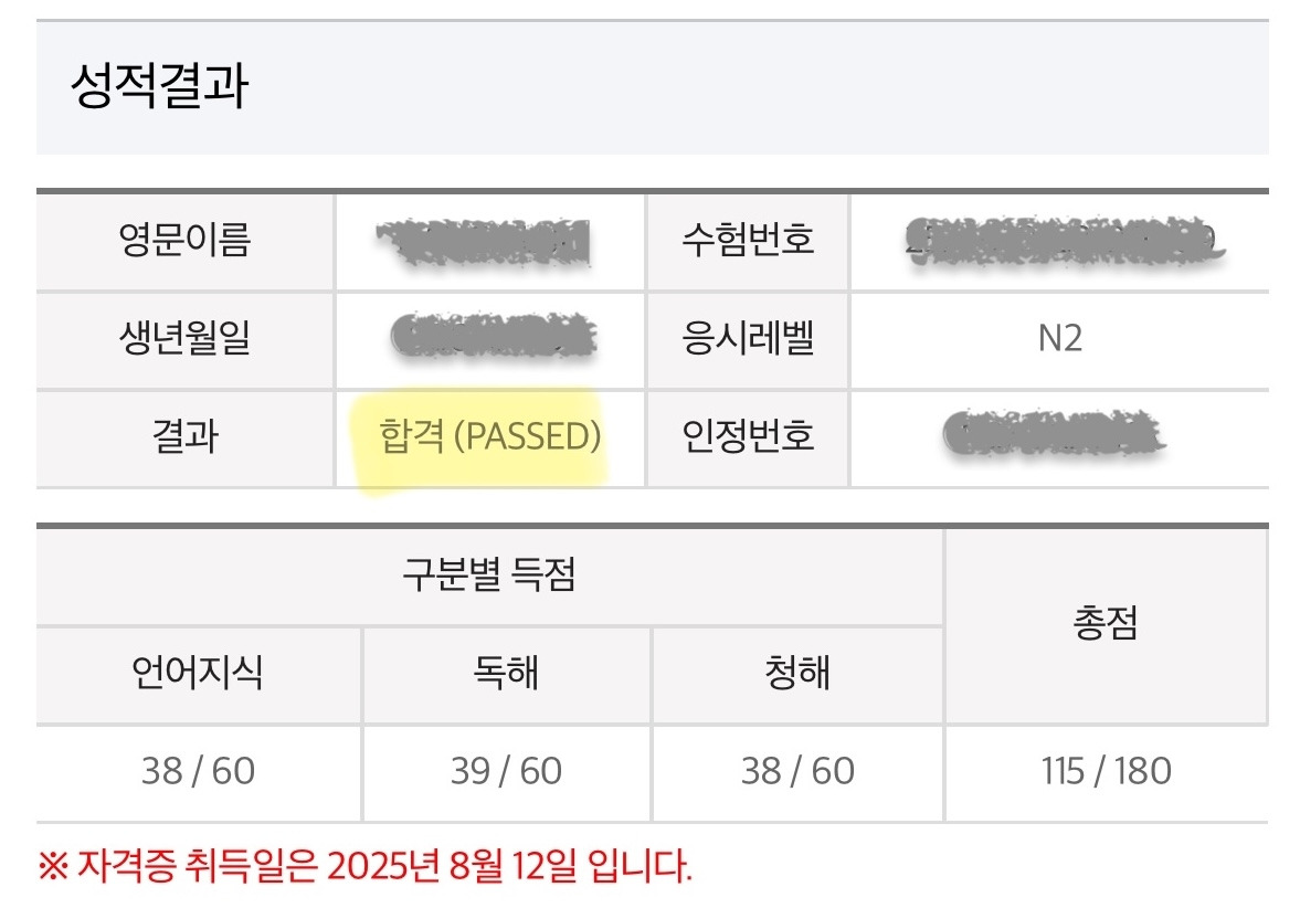 2025년 7월에 봤던 JLPT N2 시험에 합격했다!