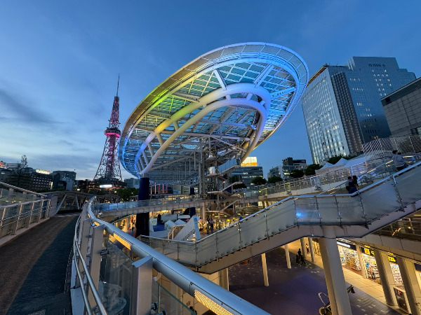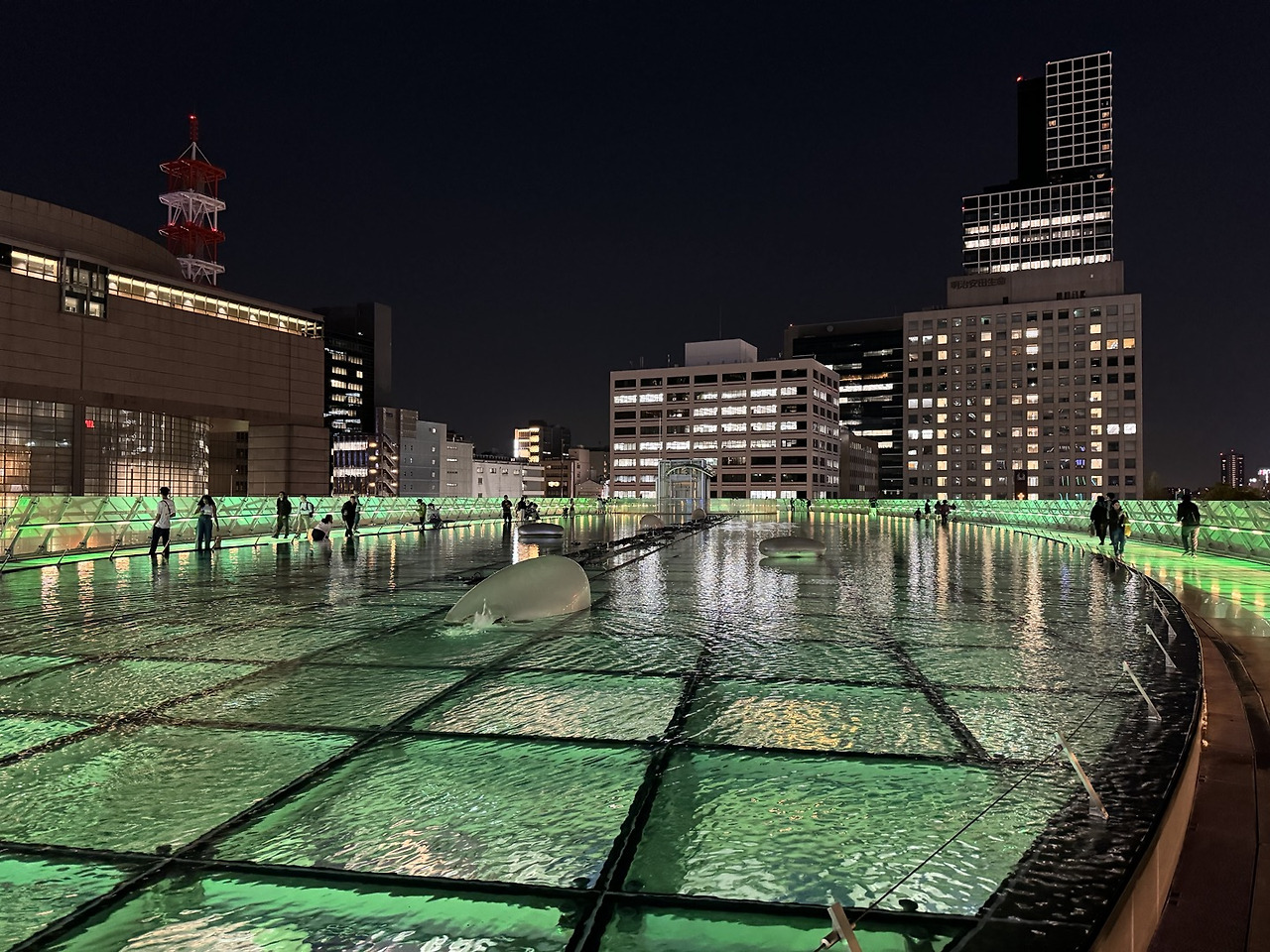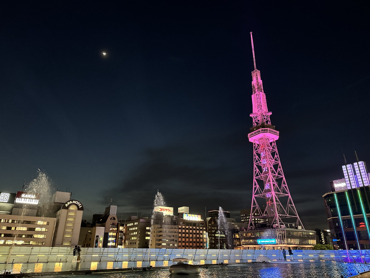 그렇게 반신반의하며 루프탑에 올라갔더니 물 위에 떠 있는 것만 같은 나고야의 야경이 한눈에 들어왔다. 잔잔한 BGM과 함께 이따금씩 솟구치는 분수, 핑크색으로 빛나는 미라이 타워를 바라보며 다사다난했던 나고야에서의 첫날을 떠올렸다. 그리고 한동안 물에 비치는 야경을 멍하니 감상했다. 물이 긴장했던 마음을 평온하게 잠재워주었다.