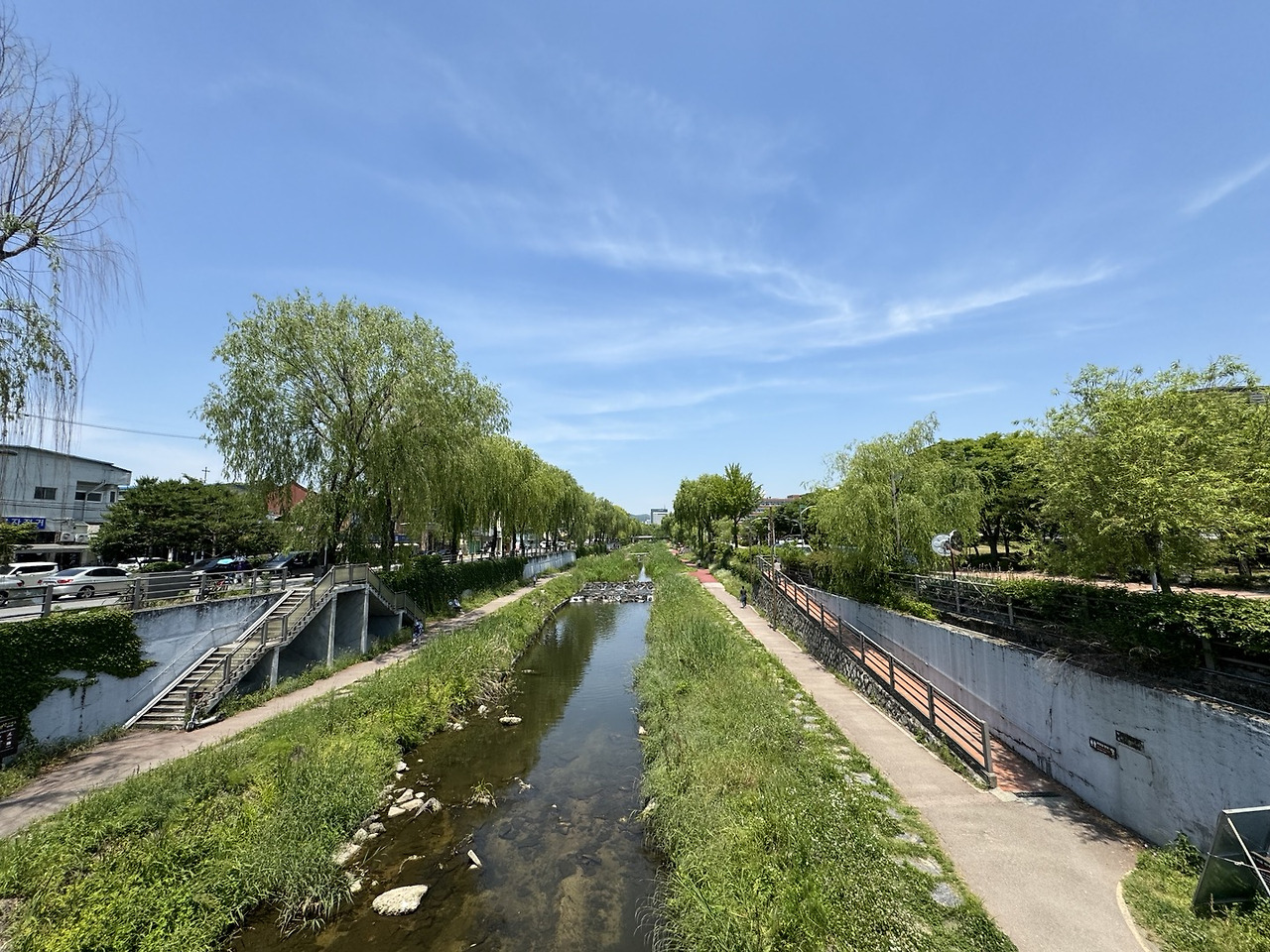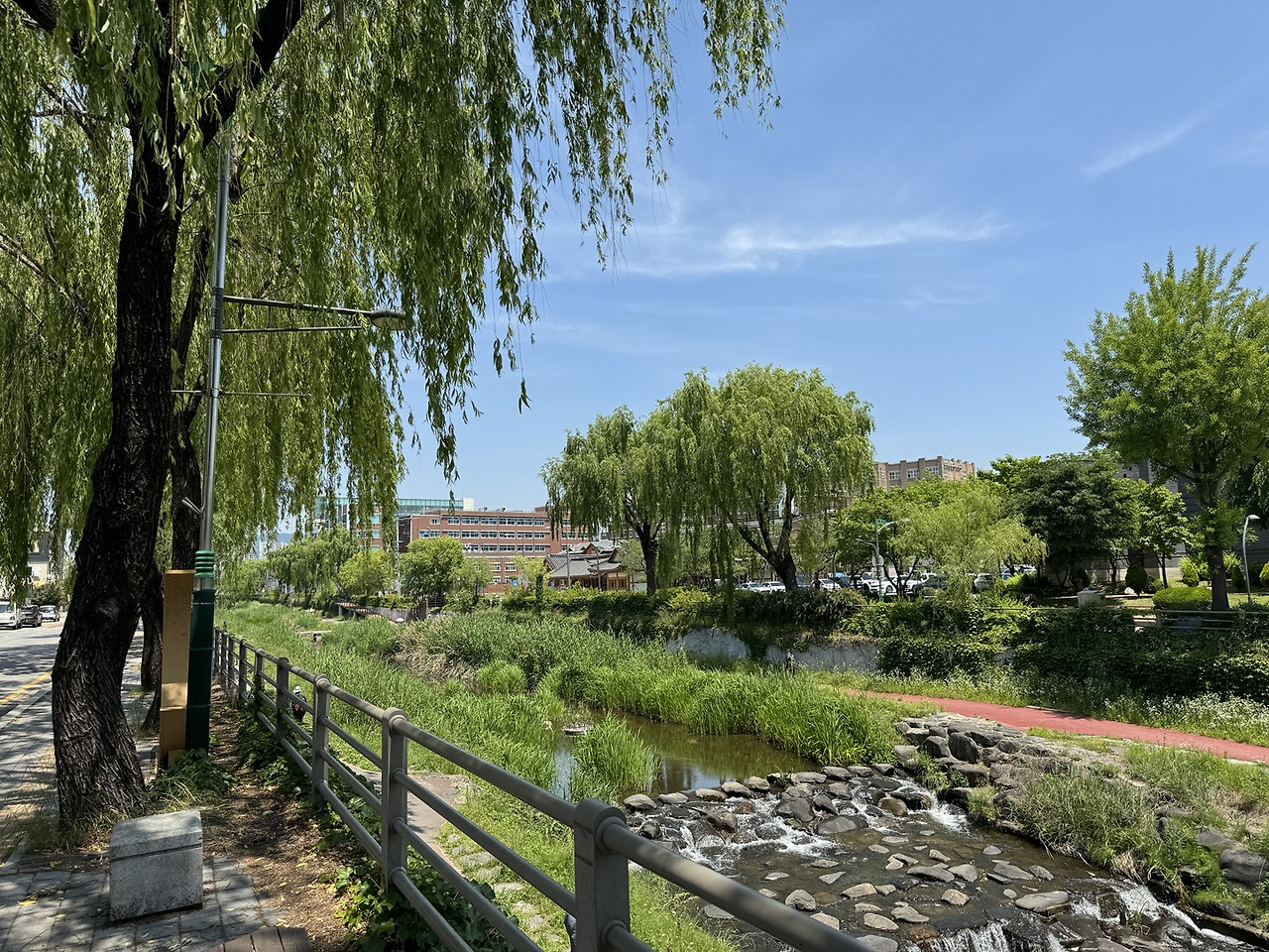초록의 버드나무가 양 옆으로 드리운 맑은 물의 수원천과 파란 하늘이 완연한 봄날의 조화를 이룬다.