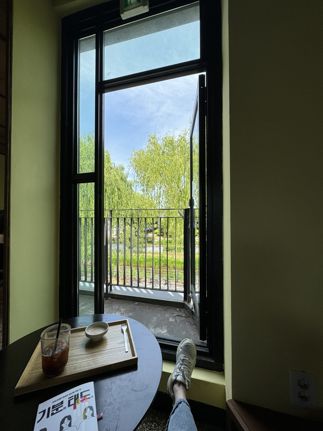 바깥의 수양버들을 바라보며 '나를 위한' 여유를 음미할 준비가 되었다.