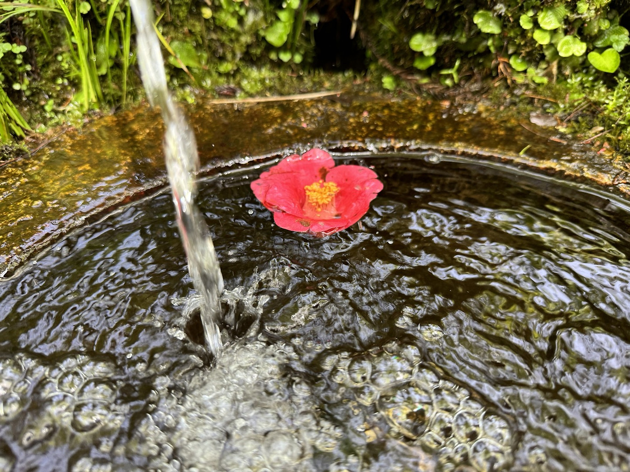 물에 곱게 떠있는 동백꽃 한 송이가 초록의 배경에 콕- 점을 찍어 놓은 듯 선명한 붉은빛을 발한다.