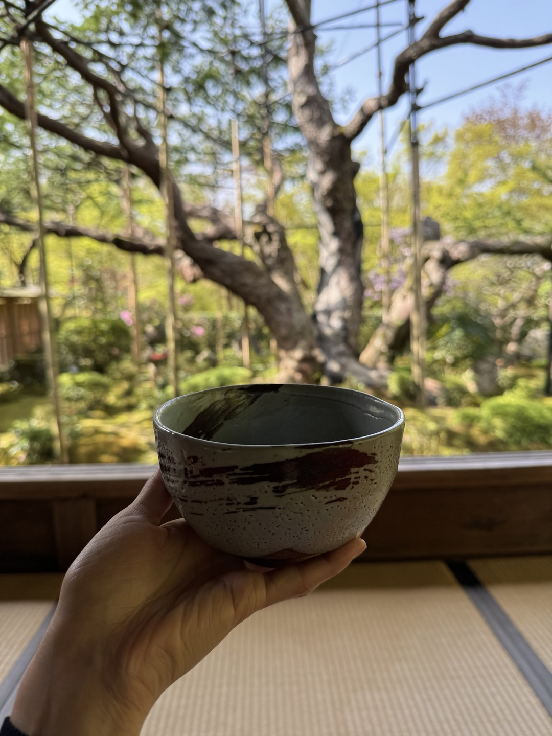 시원한 풀냄새가 코로 밀려 들어오고, 따뜻한 말차는 목을 적셔준다.
