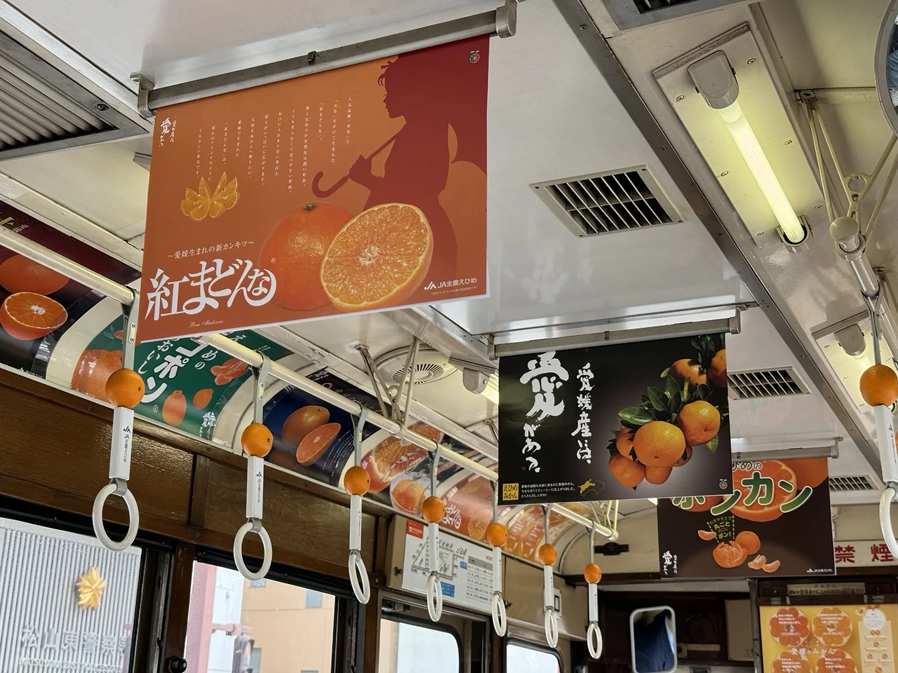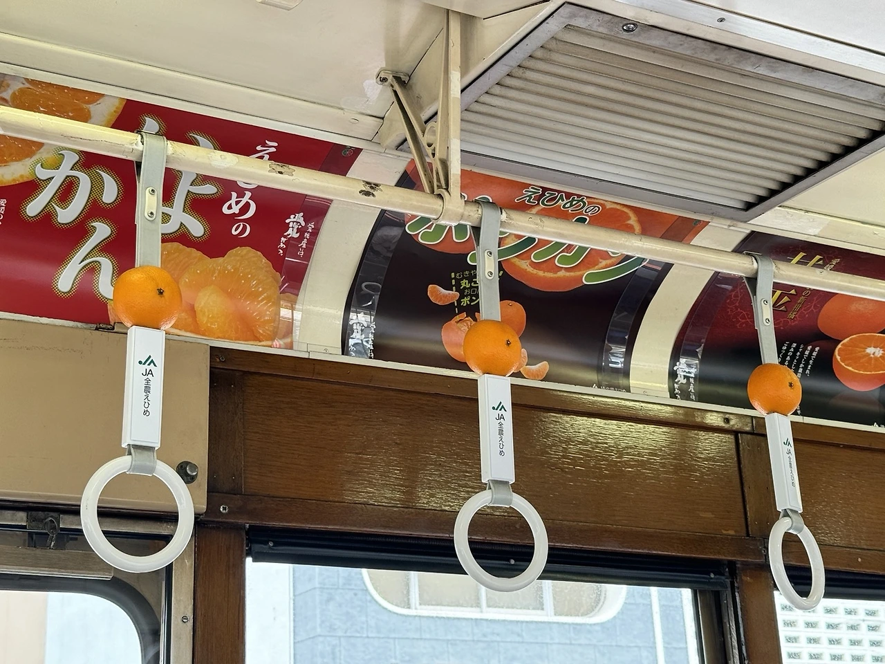 노면 전차를 타서 고개를 들어 보니 내부가 온통 ‘귤천지’이다.