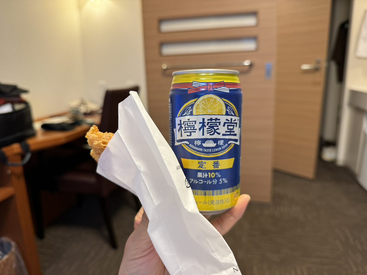 시원한 캔 레몬사와에 치킨너겟 몇 조각으로 간단한 저녁을 먹은 후.
