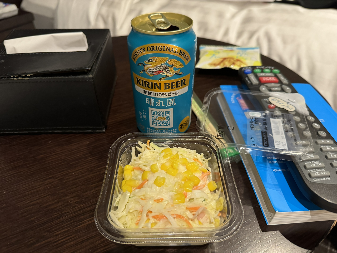처음 보는 파란색의 기린 캔맥주와 콘샐러드 조합도 신선했다.