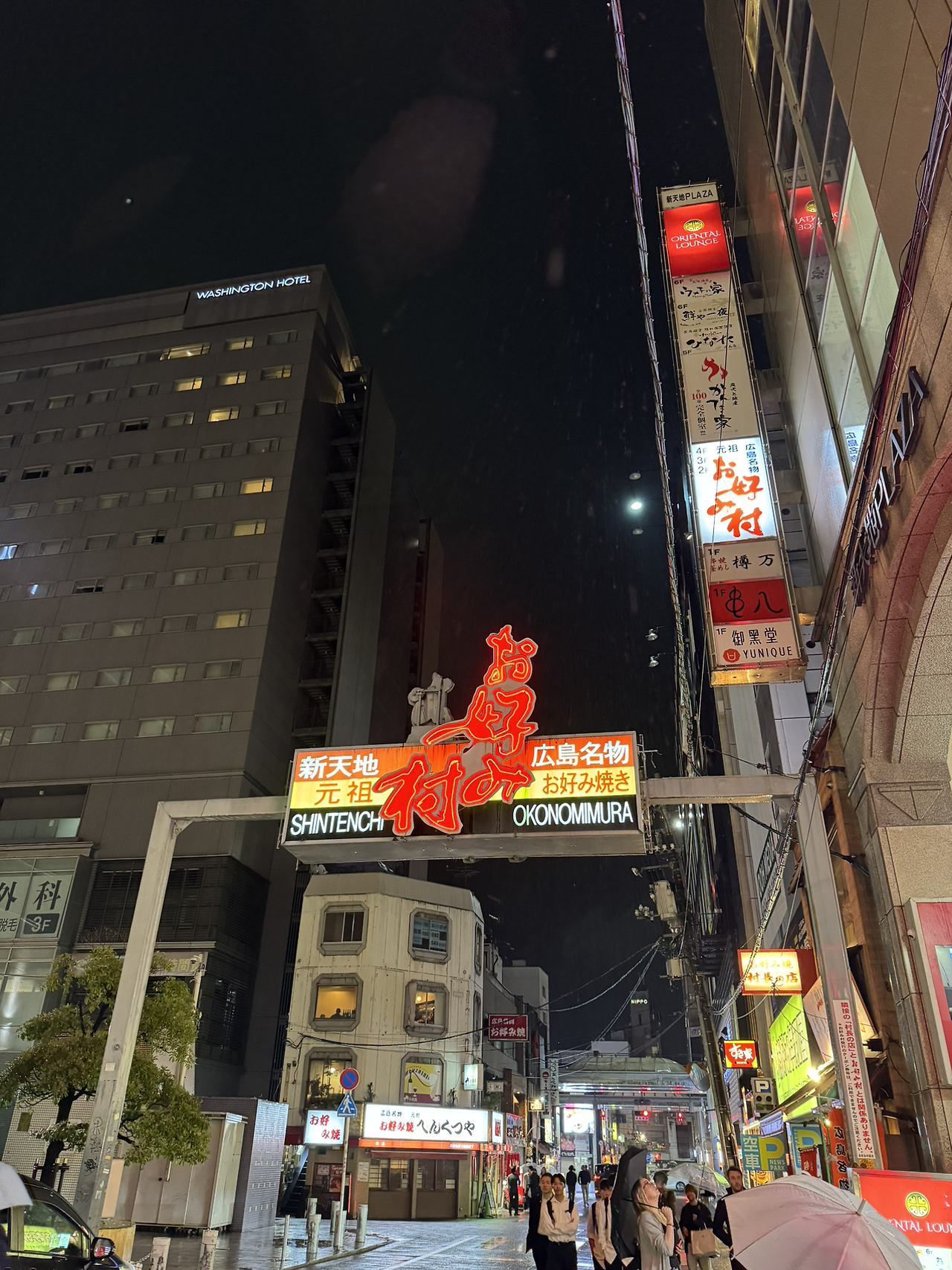 호텔로 걸어 돌아오는 길에 ‘오코노미무라’ 간판을 찍었다. 오른쪽 건물이 통째로 오코노미야키 식당이 모인 ‘오코노미무라’이다. 머무는 동안 히로시마 오코노미야키를 꼭 한번 먹어보아야겠다고 생각했다.