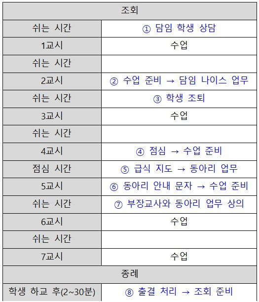 교사가 된 후 한동안은 학교에 있으면 언제나 정신이 없다는 점이 나를 가장 힘들게 했던 것 같다. 교사가 하는 일은 주로 수업, 담임 업무, 행정 업무로 나눌 수 있는데 내 경우에는 그 총량이 적지는 않았지만 아주 많지도 않았다. 문제는 이 일을 했다 저 일을 했다 할 수밖에 없는 것, 그러니까 타의에 의해 업무 간 전환을 굉장히 자주 해야 했다는 것이다. 내 일과에 고정된 일정은 아침 조회, 하루에 3개 내지 4개의 수업, 종례 및 청소 지도였다. 그 정도를 고정해 두고 가상의 하루를 구성해 봤다. 표의 내용과 ①~⑧의 설명은 경험을 바탕으로 한 가상의 내용이다. 실제로는 저보다 한가할 수도 있지만 저보다 훨씬 바쁜 날도 많다.