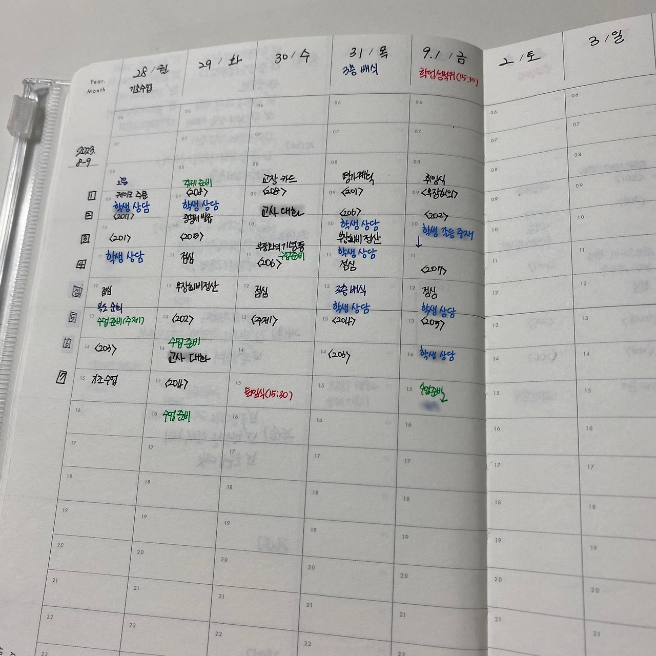 4) 그 외의 칸은 실제 업무를 수행한 후에 기록했는데 행정 업무는 검은색, 수업 관련 업무는 연두색, 생활지도 관련 업무는 남색, 회의 등의 일정이나 갑작스러운 보강처럼 까먹기 쉬운 일정은 빨간색으로 구분해 표시했다. 첫 번째 사진은 색깔 구분을 확실하게 하지 않았고 수련 활동으로 인해 행정 업무가 많아서 검은색이 많은데, 두 번째 사진은 다양한 색깔이 있다. 남색으로 '학생 상담'이라고 써 놓은 부분은 생활지도 업무로 학생 이름이 드러나 모자이크 처리했다. 두 번째 사진의 상담뿐 아니라 첫 번째 사진의 생교위 조치에 따른 '교내봉사'도 남색으로 표시했다.