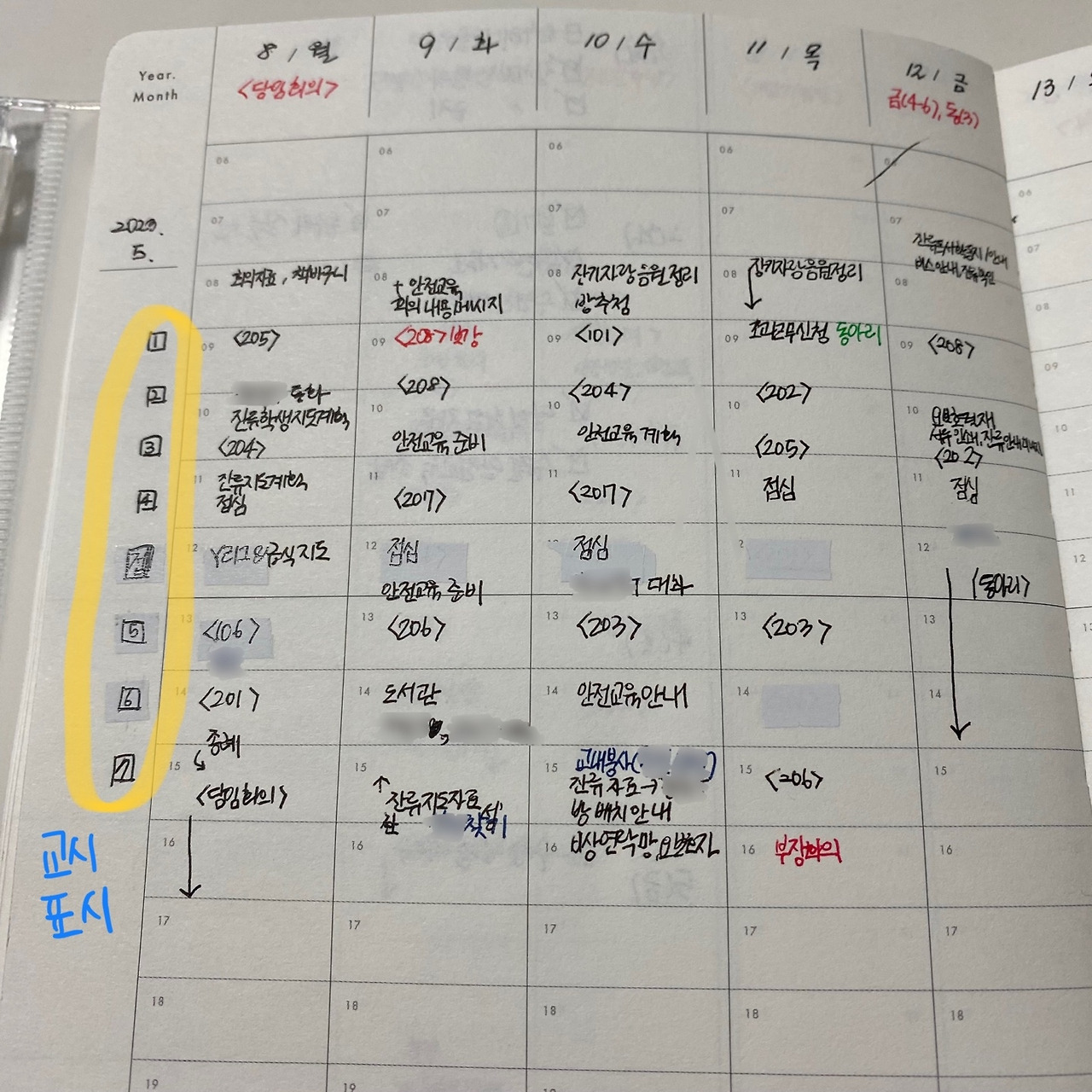 2) 고정된 일정, 예를 들면 수업이나 부장 회의 같은 것을 미리 표시했다. 1학년 1반 수업은 <101>, 부장회의는 <부장회의>와 같이 표시했다.