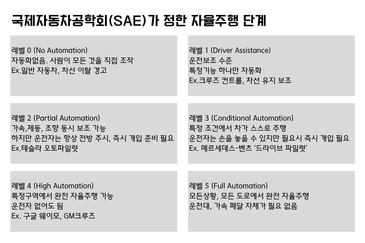 국제 자동차 공학회(SAE)는 자율주행 기준을 정했다. 숫자가 올라갈수록 사람의 개입이 줄어들고, 시스템이 더 많은 것을 대신하는 것을 뜻한다.