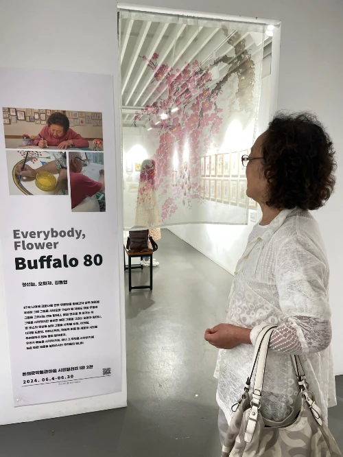 70세 이후 각기 다른 자발적 동기로 그림을 새로운 벗삼아 생활하는 80세 이상의 할머니 할아버지 작가들의 작품을 선보이는 자리입니다. 버팔로 80이라는 제목에는 들소처럼 강인한 삶의 여정이 느껴지는 할머니 할아버지의 예술적 힘을 내포하며, 부제인 ‘에브리바디, 플라워’는 모두가 누군가에게는 꽃처럼 소중한 존재임을 의미합니다.