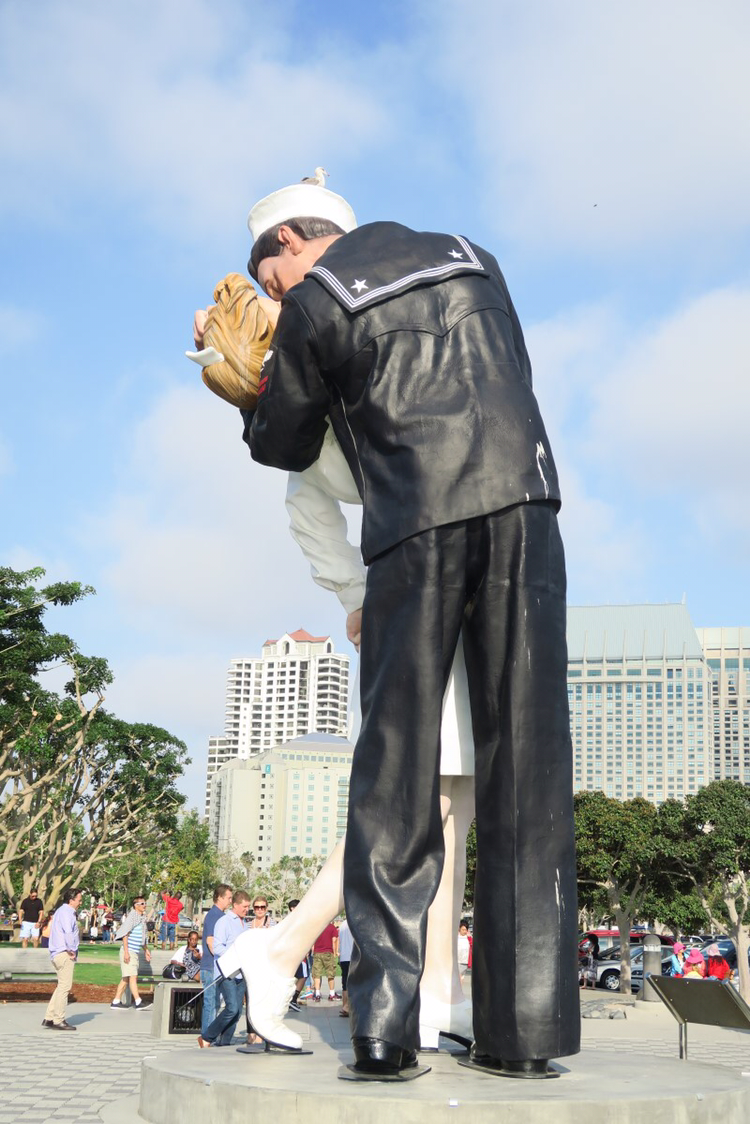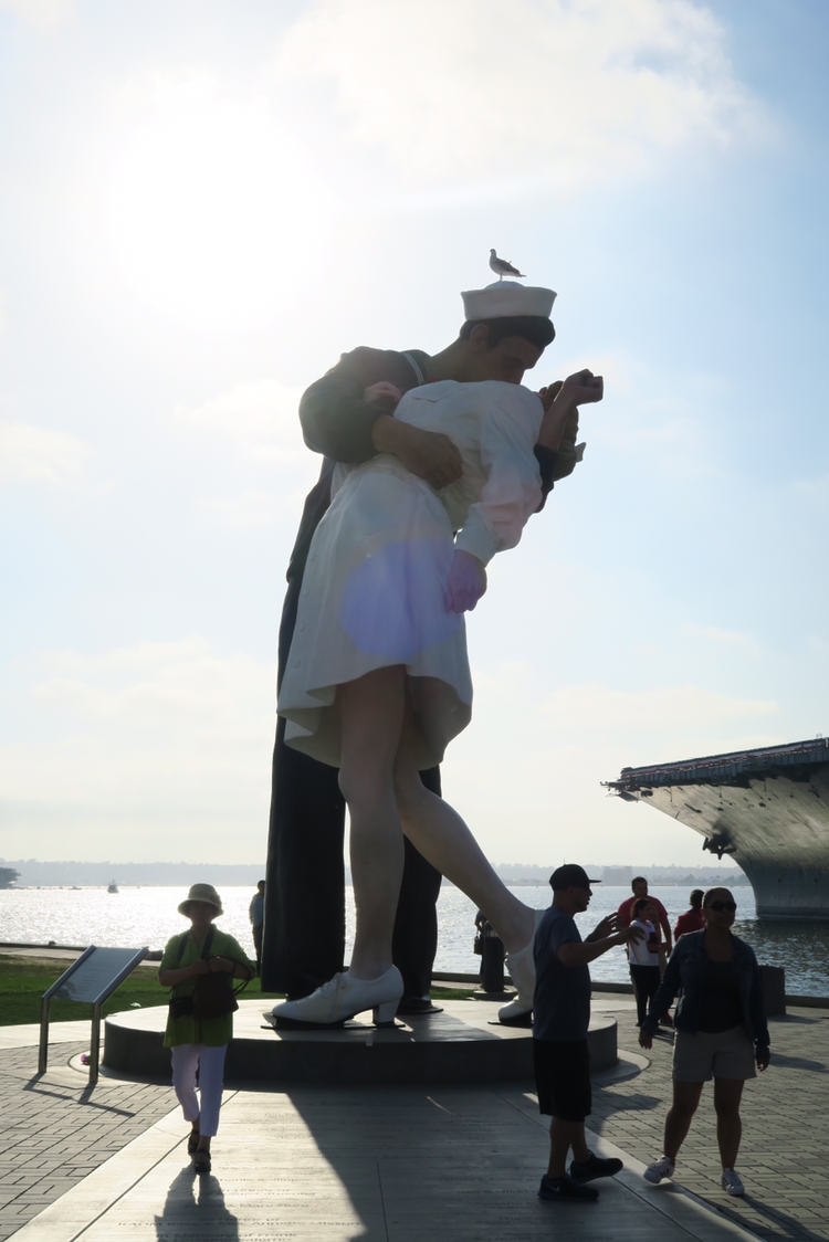 다시 한 참을 걷다보니 해양박물관인 큰 군함과 수병의 키스 동상이 보였다. 이 동상은 2차 세계대전이 끝난 것에 기뻐한 나머지 한 해군 병사 한 명이 간호사 복장을 한 여성을 안고 키스하는 장면을 사진으로 찍고 그것을 동상으로 만든 것이다. 그런데 이 두 사람은 서로 모르는 사이였다고 한다. 전쟁이 끝난 것이 너무 기뻐 지나가는 간호사를 붙잡고 키스한거라고.