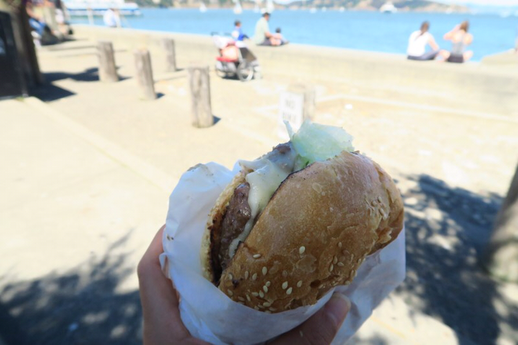 소살리토에서 페리를 타고 샌프란시스코 페리빌딩으로 갈 예정이라서 위치도 알아놓을 겸 페리선착장 근처에서 내렸다. 소살리토에서 도착하니 이제야 배가 고팠다. 선착장 바로 앞에 햄버거집에서, 가게 이름도 '햄버거', 햄버거와 콜라를 사서 앉아서 먹을 장소를 찾았다. 바다와 저 멀리 샌프란시스코 도시를 보면서 잠시 앉아서 쉬면서 숨고르기를 할 수 있는 곳을 발견했다. 이미 사람들이 군데군데 자유롭게 자리를 잡고 누워 햇볕을 쬐는 사람들, 담소를 나누는 사람들, 나처럼 한끼 점심 식사를 하는 사람들.. 옆 까페에서 흥겹게 흘러나오는 음악이 분위기를 더 즐겁게 한다.