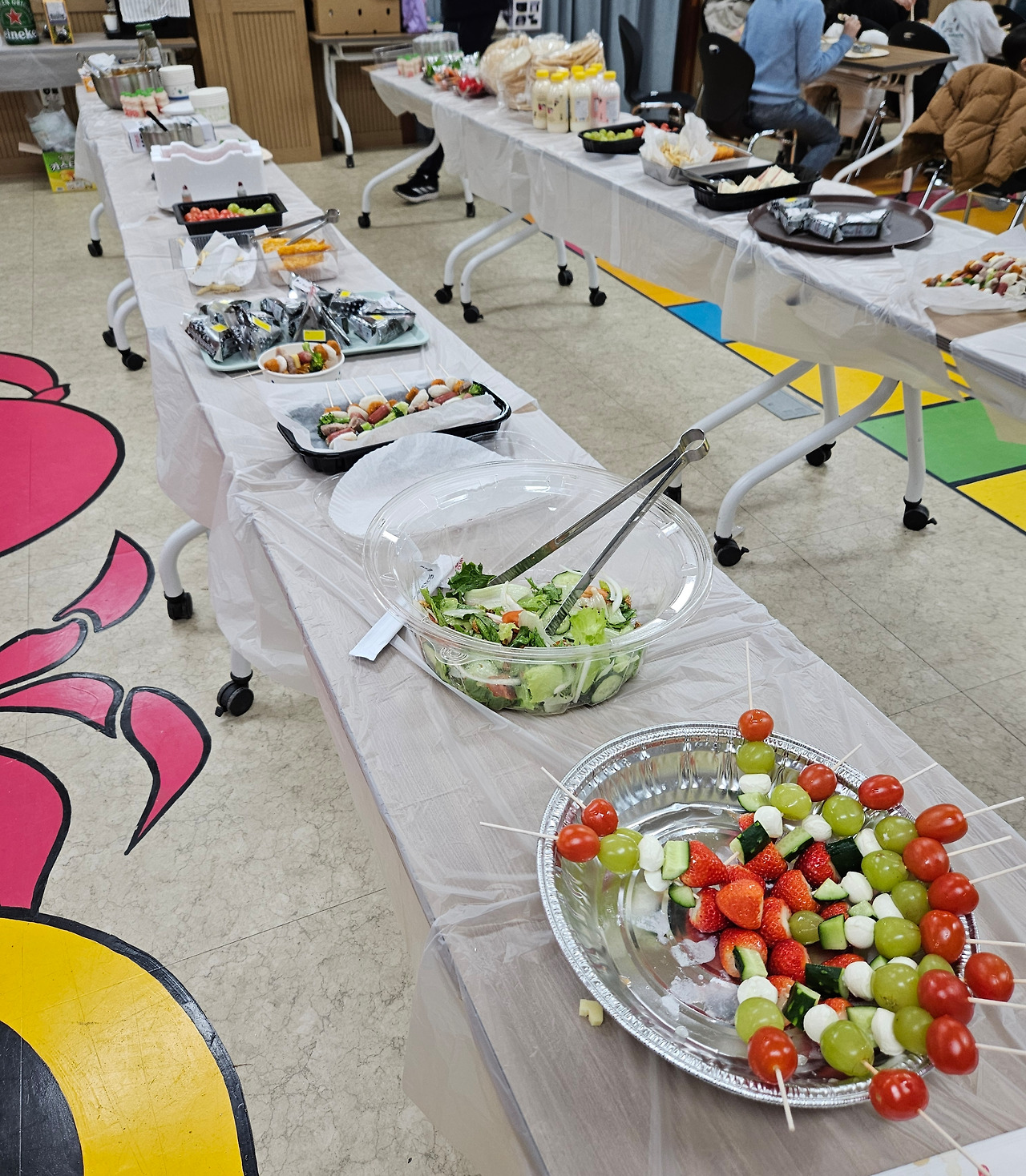 그리고 3월 3일 대망의 첫 등교일, 연기된 달집 태우기가 예정된 날. 우리 아이들이 다니는 초등학교는 작년 농촌유학 가족 대부분이 1년 더 기간을 연장해서 지내고 있다. 나보다 1년 먼저 농촌유학을 온 선배 엄마들이 단톡방을 만들어서 신규 엄마들을 초대했다. 등교 첫날 아이들 하교 후 마을 복지회관에서 아이들과 함께 만나자고 한다. 간단한 다과회 정도를 생각하고 갔는데, 아이 두 명의 생일파티를 겸한 자리였고, 두 아이의 엄마들이 직접 준비한 음식의 가짓수가 열 가지도 넘었다. 맛있었고 양도 많았다. 이미 학교에서 서로 얼굴을 익힌 아이들은 삼삼오오 둘러 앉아 음식을 먹고, 자기들끼리 어울려 놀기 시작했다. 활동적인 딸은 바깥놀이 무리에 껴서 술래잡기 계단뛰기에 정신이 없고, 아들은 마음 맞는 다른 친구들과 실내에서 보드게임에 열심이다.