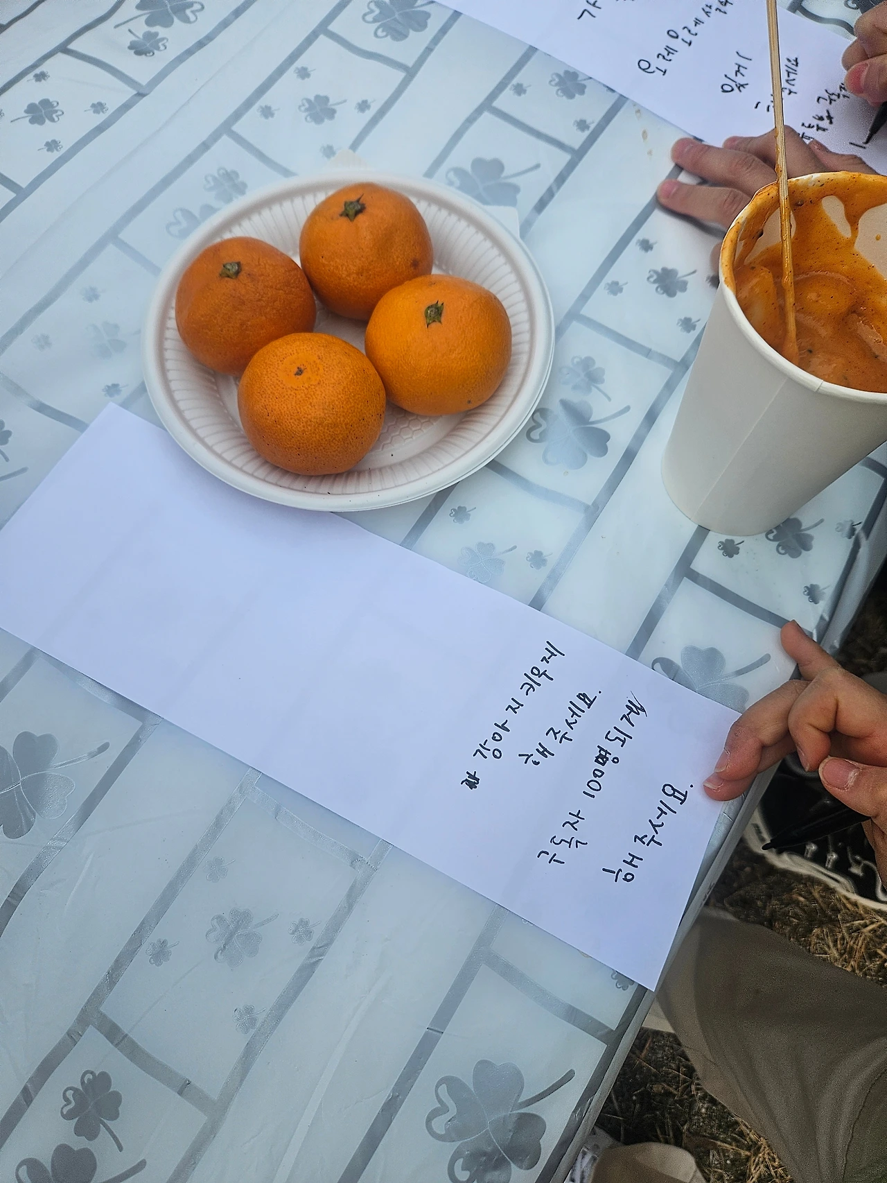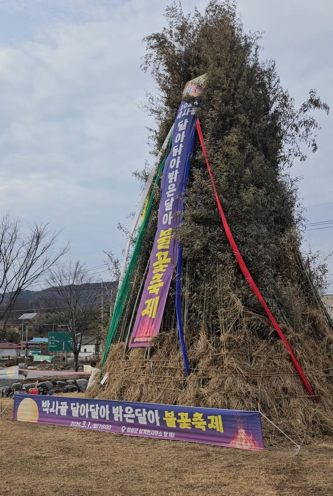 떡볶이, 어묵, 수육, 떡, 국밥 같은 잔치 음식을 원하는 만큼 공짜로 받아다 먹을 수 있다. 술과 음료까지 무료여서 깜짝 놀랐다. 그리고 마을 주민이 아니어도 참가자 전원이 꽝 없는 행운권 추첨을 할 수 있었다. 어린이도 참여가 가능해서 가족 모두 경품을 하나씩 받았다. 축제장 한켠에는 종이와 펜이 마련되어 있었다. 종이에 소원을 써서 달집 태울 때 함께 태우는 것이다. 신중하게 소원을 쓰고 종이를 접어서 나무에 매는 아이들의 태도가 사뭇 진지했다.