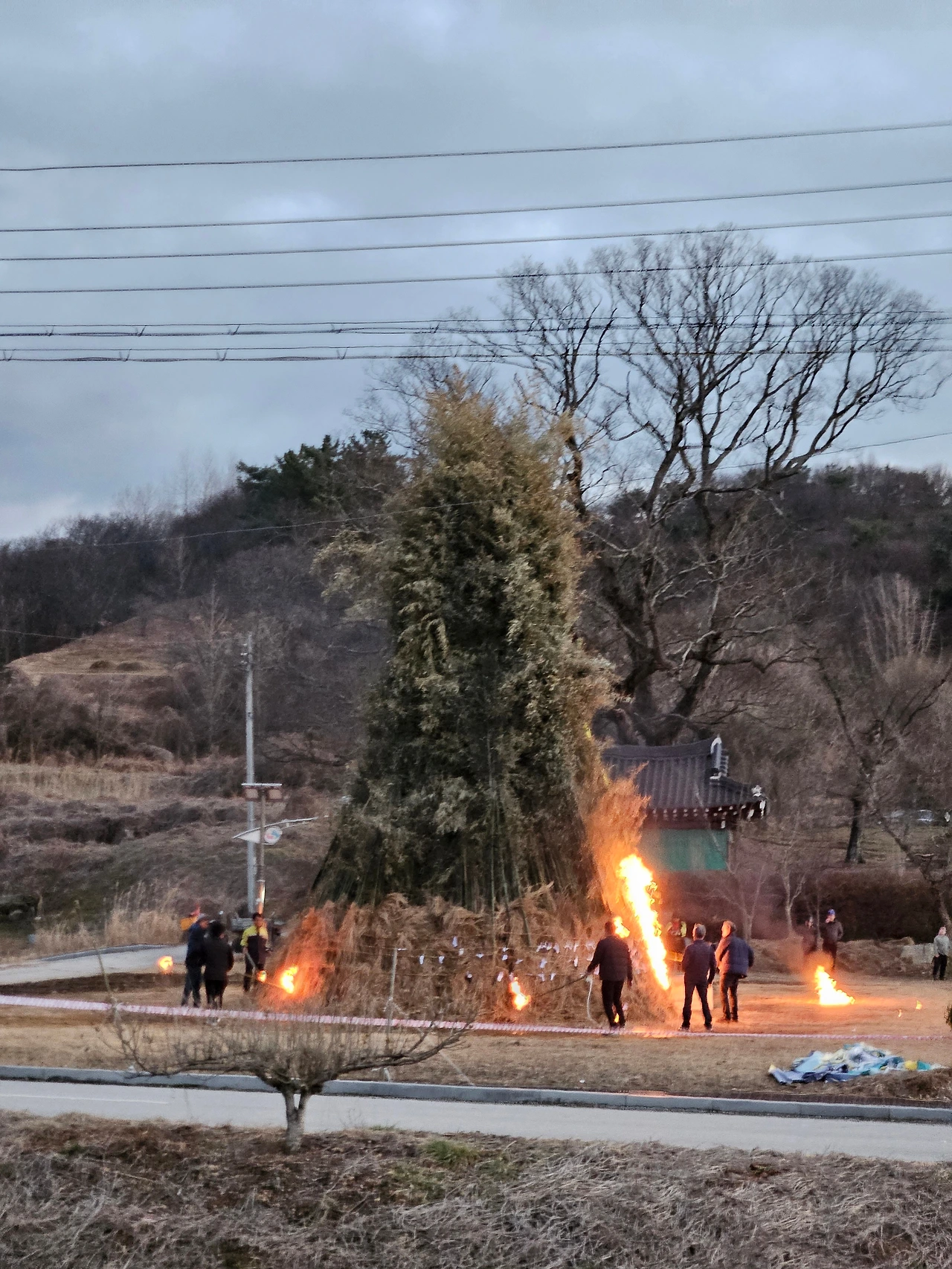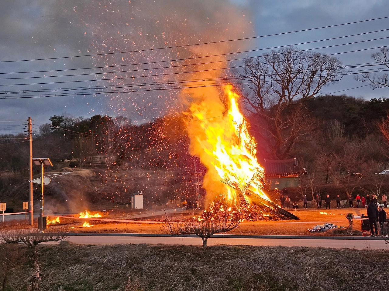 아이들이 가장 고대했던 달집 태우기는, 소방차까지 왔는데 바람이 점점 거세져서 이틀 뒤로 연기되었다. 대신 불꽃놀이는 예정대로 진행되었다. 마을에서 하는 불꽃놀이 작고 귀여운 수준이려나 했는데, 또 기대 이상이었다. 한 눈에 잘 들어오지 않을 정도로 큰 규모의 불꽃이 몇 분 연속 계속 터졌다. 가까운 곳에서 터지는 불꽃에 눈이 부시고 귀가 먹먹했다. 불꽃놀이를 이렇게 가까이에서 본 것은 처음이고, 가까우면 불꽃의 파편이 튀기도 한다는 것을 처음 알았다.
