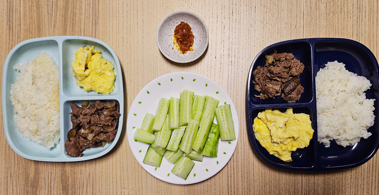 불고기 양념은 몇 년 전부터 직접 만들고 있다. 간장, 다진 마늘, 간 양파, 올리고당 4가지 재료면 충분하다. "요리는 간만 맞으면 된다"는 요리천재 친정 엄마 말에 따라 간을 맞추는 것에 집중하고(고기 100g에 간장 1.2스푼이라는 나름의 기준이 있다), 나머지 양념(마늘, 양파, 올리고당)은 그날 기분과 취향에 따라 '적당히' 넣는다. 먹기 1시간 전에만 양념해도 충분히 양념이 잘 배기 때문에, 바쁜 날에도 후다닥 준비해서 요리하기 좋은 메뉴다. 계란찜 육수로 사용한 표고버섯을 채 썰어 불고기와 함께 볶았더니, 고기를 덜 먹고 야채를 더 먹을 수 있어 좋았다. 불고기를 볶을 때 양배추, 호박 등 집에 있는 야채를 함께 볶는다. 고기 섭취를 조금 줄이기로 마음먹은 나를 위한 재료 추가다. (애들은 아무래도 야채를 싫어한다. 나도 어릴 때 야채를 싫어했다.)