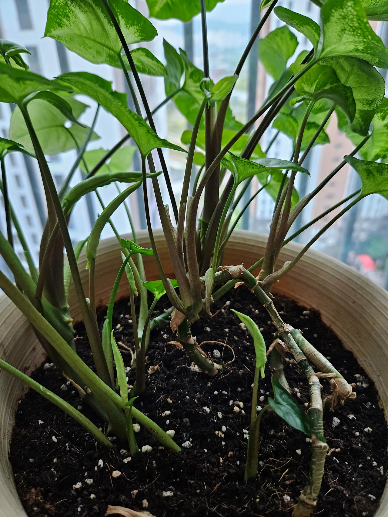 우리 부부 둘 다 화분을 키워본 경험이 없어서 싱고니움에게 고생을 많이 시켰다. 신혼여행으로 집을 일주일 동안 비우면서 햇빛을 충분히 받으라고 창틀에 올려놓고 갔더니, 싱고니움 잎이 온통 흰색으로 변하는 고초도 겪게 했고(나중에 알고 보니 직사광선을 싫어한단다. 식물은 무조건 해를 좋아하는줄 알았다.) 햇빛이 잘 안 드는 비좁은 선반에 오래 뒀더니 잎이 앙상해지고 웃자라며 이파리가 서너장밖에 안남기도 했다.