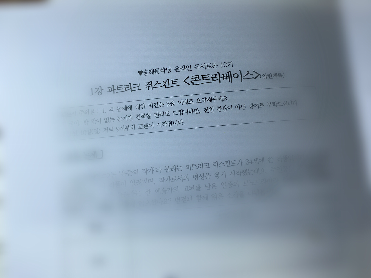 12월은 온토를 하지 않았기에 오래간만에 독서토론으로 마감하는 일요일이었다. 오늘의 책은 파트리크 쥐스킨트의 콘트라베이스이다. 파트리크 쥐스킨트는 이미 독후감쓰기 모임에서 비둘기 라는 책으로 알고 있는 작가였다. (솔직히 모임이 없었더라면, 난 하나도 몰랐을 것이다.) 이렇게 들어본 작가를 한다는 것만으로도 내가 뭔가 좀 교양인이 된 느낌이었다. 콘트라베이스 라는 책 월요일에 이미 완독을 하였다. (독서토론은 일요일) 짧은 책이기도 하였고, 독백형식의 책이라 대화를 하는 느낌으로 읽었다. 내가 느낀 감정은 화자에 대한 답답함과 안타까움 나를 반영하게 만드는 글귀 이런 것들이었다. 그리고 논제가 메일로 도착하고 나서 논제를 읽으며 다시 찾아볼 내용을 다시 읽어 본다. 난 재독 (다시 읽기)를 싫어한다. 한 번 읽는 다고 다 아는 것도 아니지만, 다시 읽는 것을 꺼려하는 편이다. 그런데, 독서토론을 하면서 독후감을 적으면서 조금은 달라졌다. 체크해 놓은 부분을 다시 읽으며, 읽었을 때의 느낌을 다시 생각해보고, 고민한다. 늘 정답이 있어야 되는 것이라고 생각한 책에서 꼭 정답을 찾지 않아도 되지 않을까, 다른 사람은 나와 다른 의견을 갖고 있지 않을까, 다양한 생각을 하게 해 주었다.