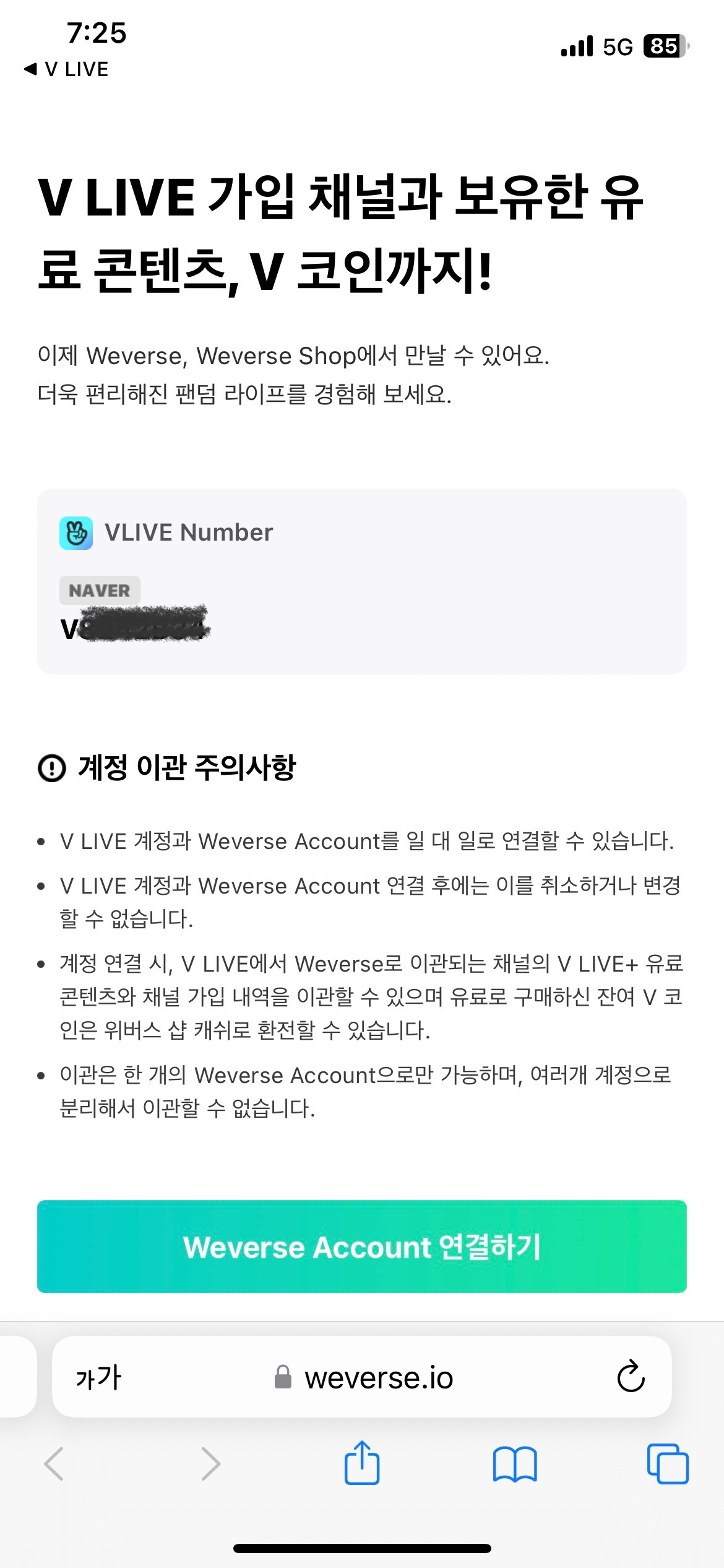 2022년 11월 네이버 V LIVE와 HYBE의 플랫폼 Weverse와 회원 통합 시, 기존에 가입했던 채널과 콘텐츠, 적립금(V코인)을 이관했던 프로세스입니다.