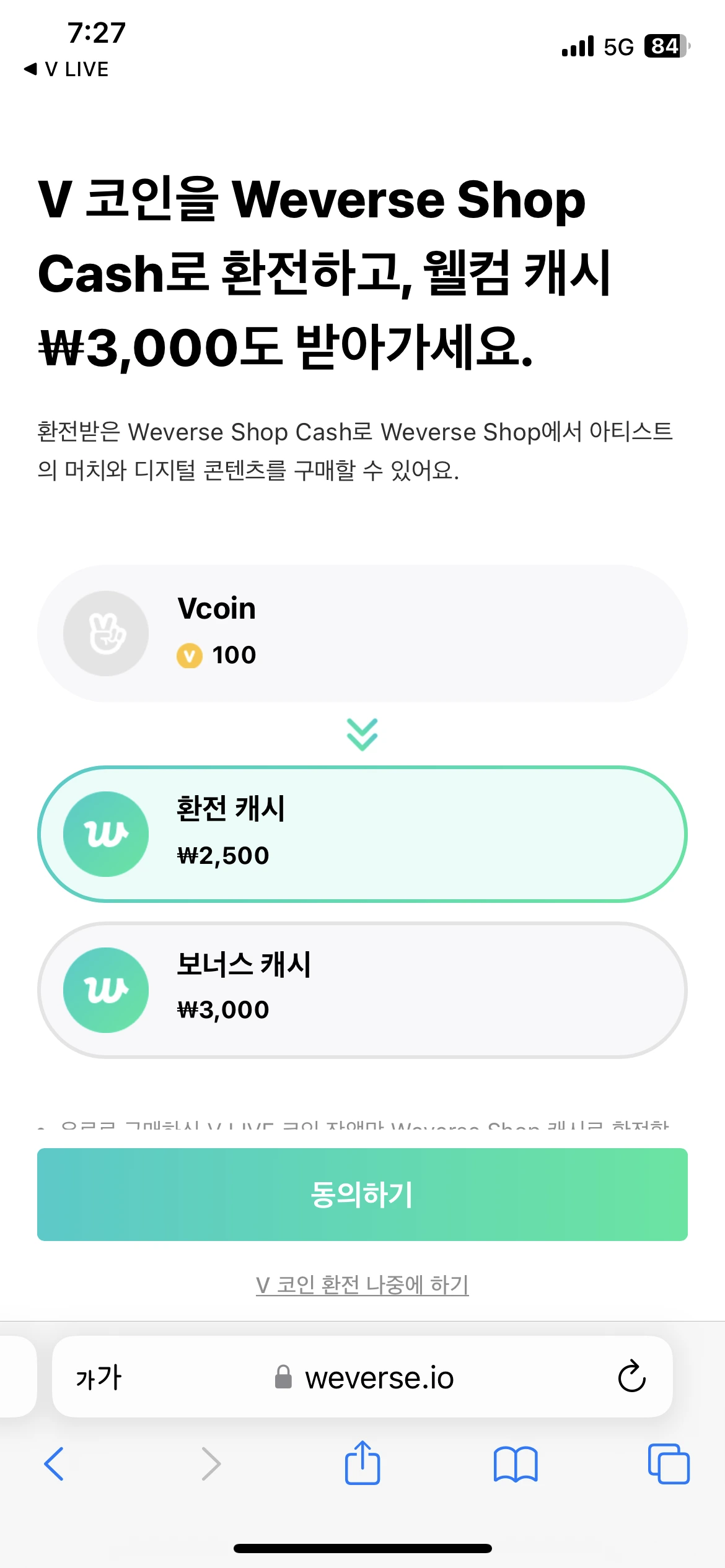 weverse 로그인 완료 시 나의 보유 Vcoin을 weverse cash로 환전 시 금액 및 보너스 캐시 안내