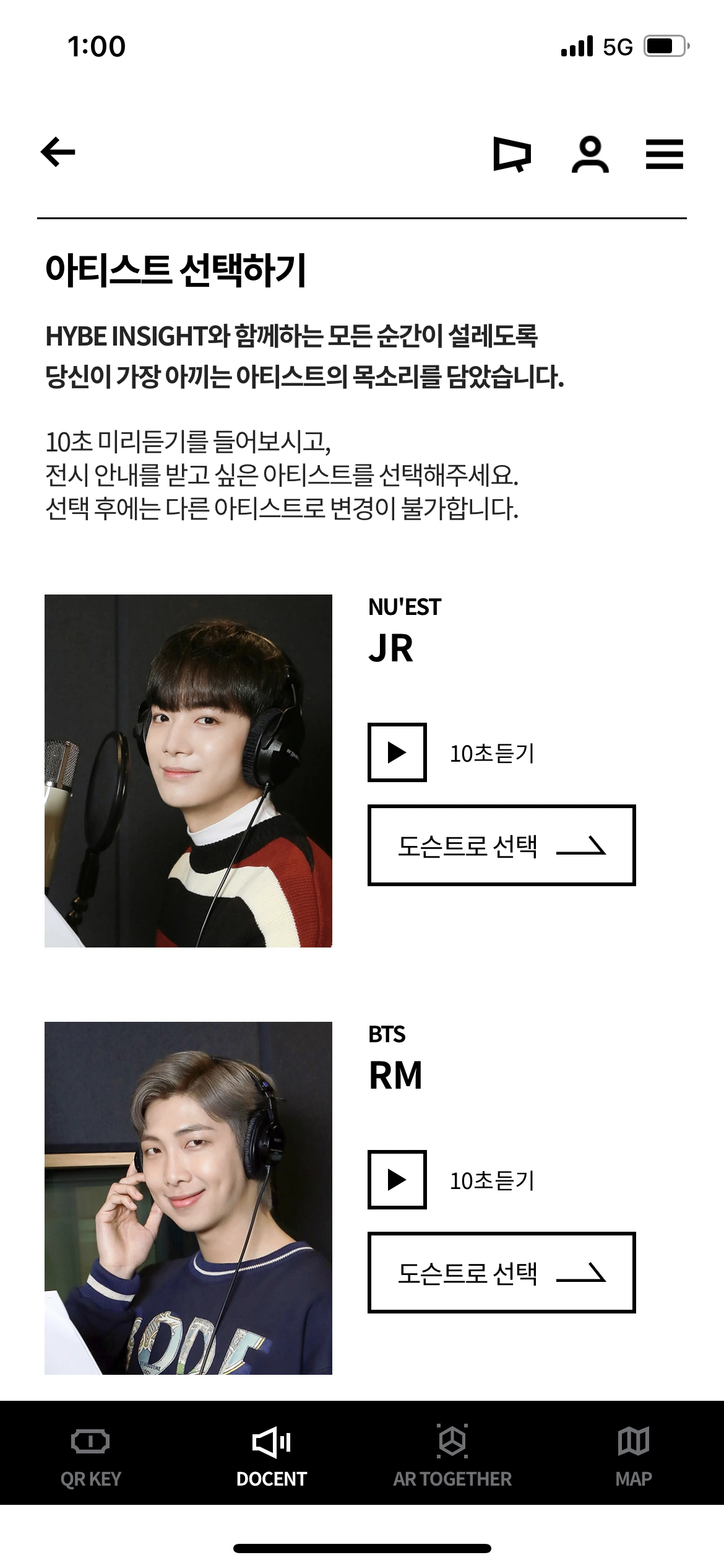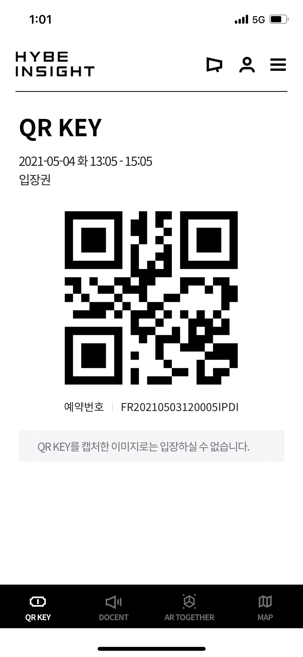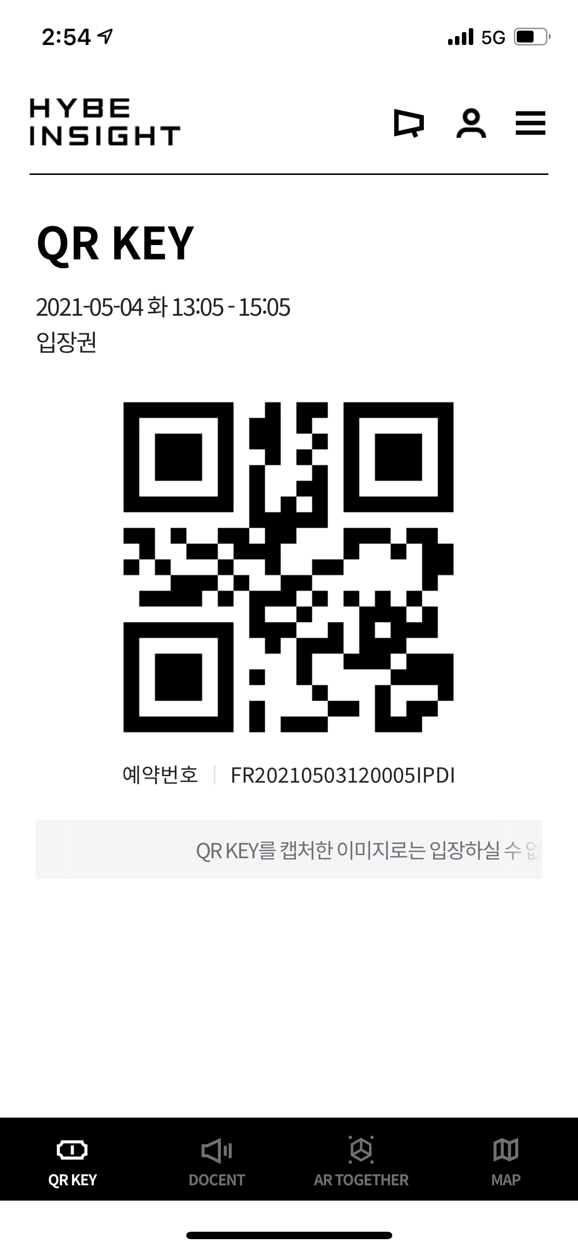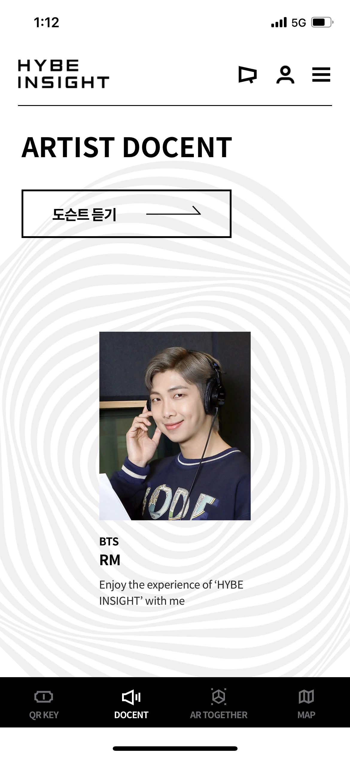 2021년 하이브 오프라인 전시를 예약하는 모바일 화면 캡쳐 입니다. 예약 내역을 관리하고 기념 카드에 인쇄할 이름을 등록하며, 현장에서는 QR코드를 스캔하려 입장합니다. 전시장에서는 아티스트를 선택하여 도슨트 서비스를 할 수 있습니다.