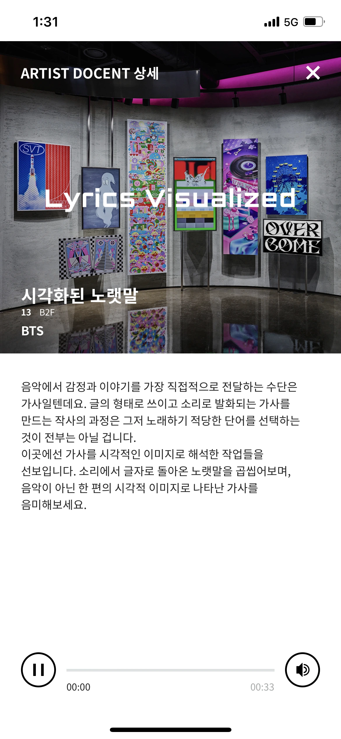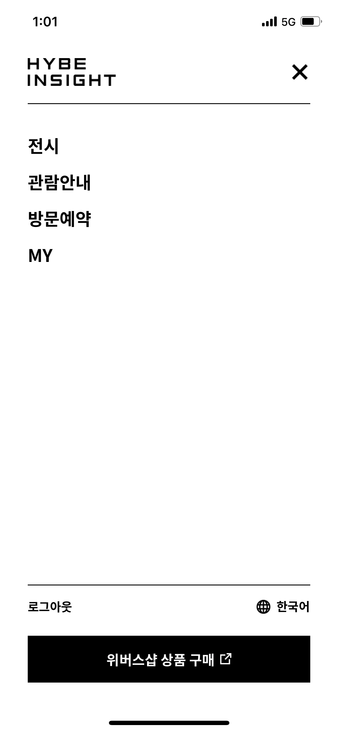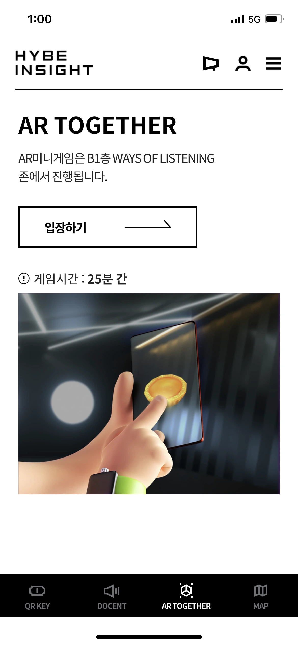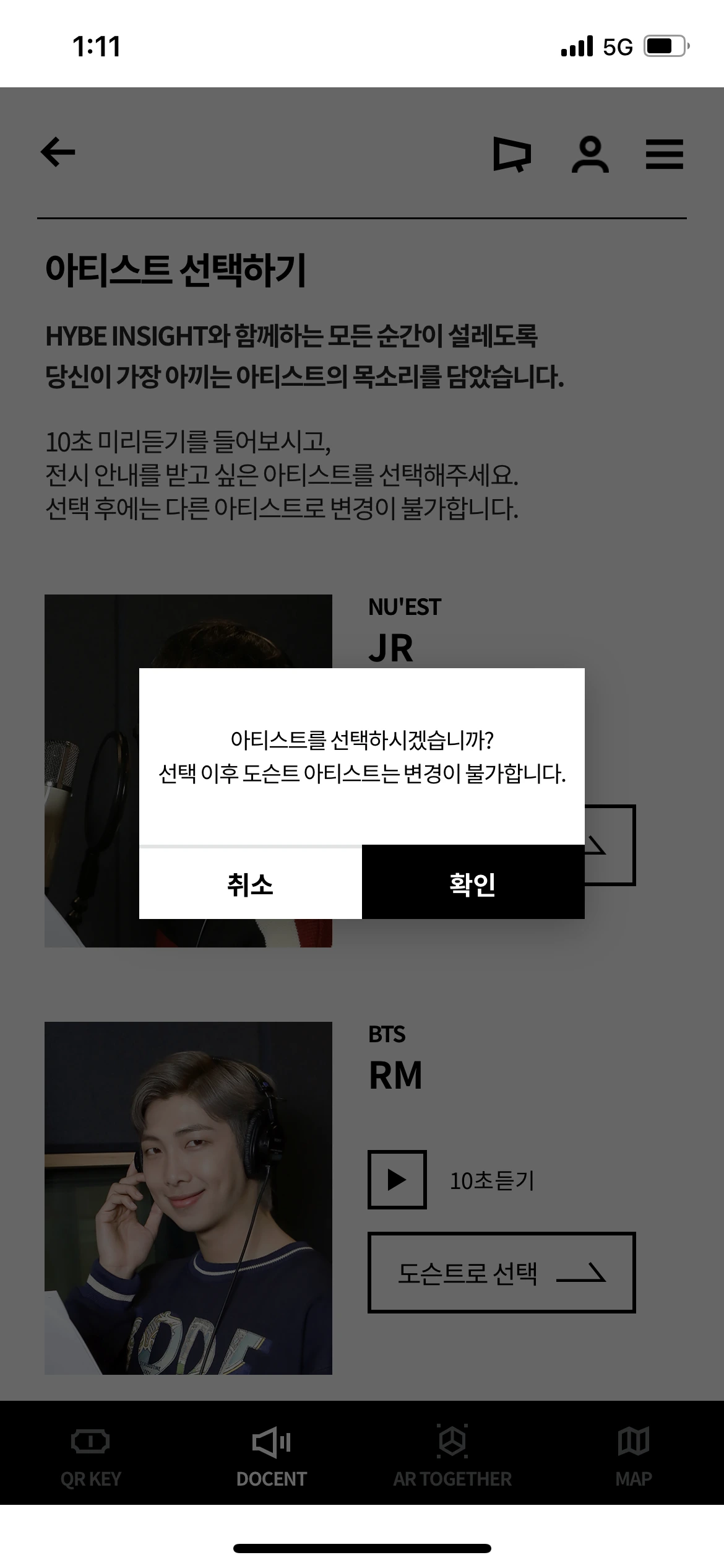 2021년 하이브 오프라인 전시를 예약하는 모바일 화면 캡쳐 입니다. 예약 내역을 관리하고 기념 카드에 인쇄할 이름을 등록하며, 현장에서는 QR코드를 스캔하려 입장합니다. 전시장에서는 아티스트를 선택하여 도슨트 서비스를 할 수 있습니다.