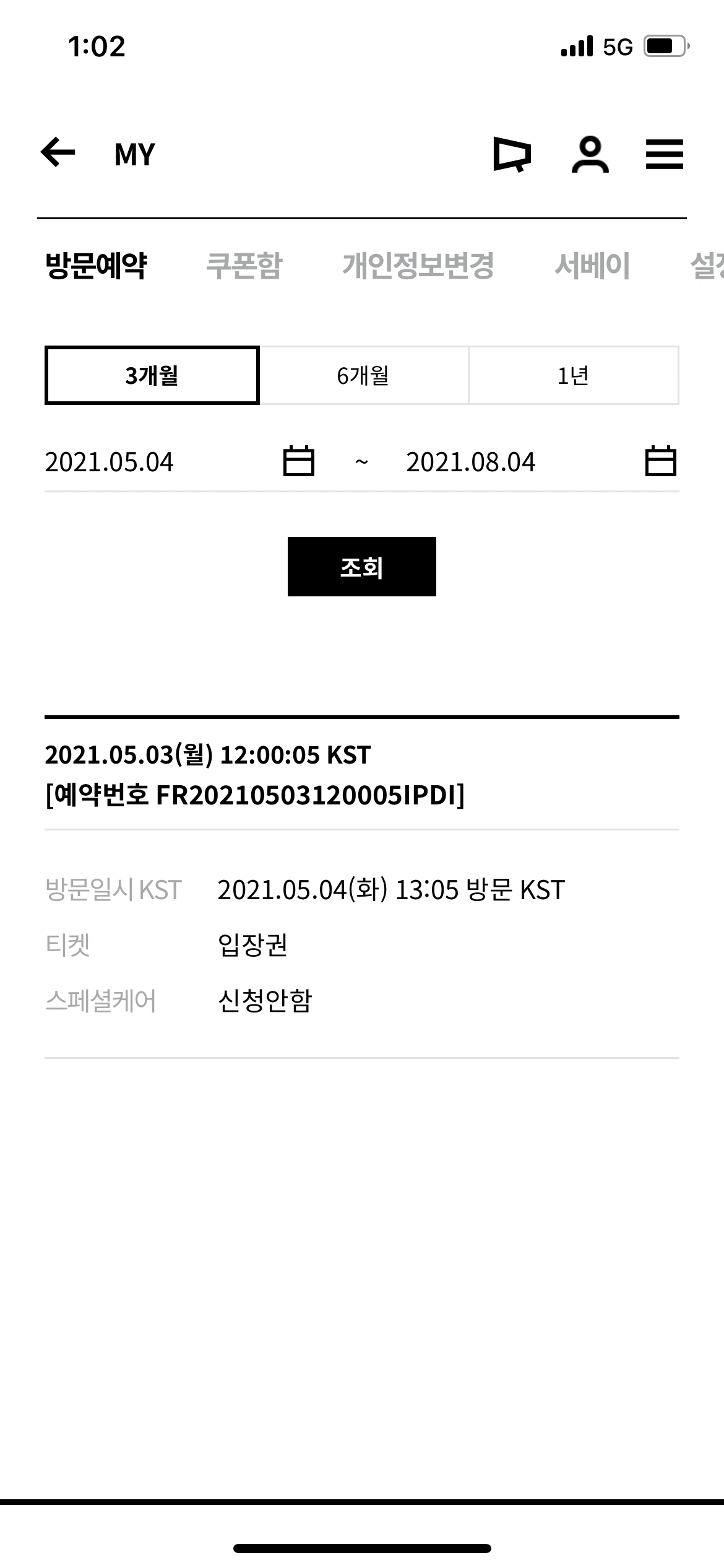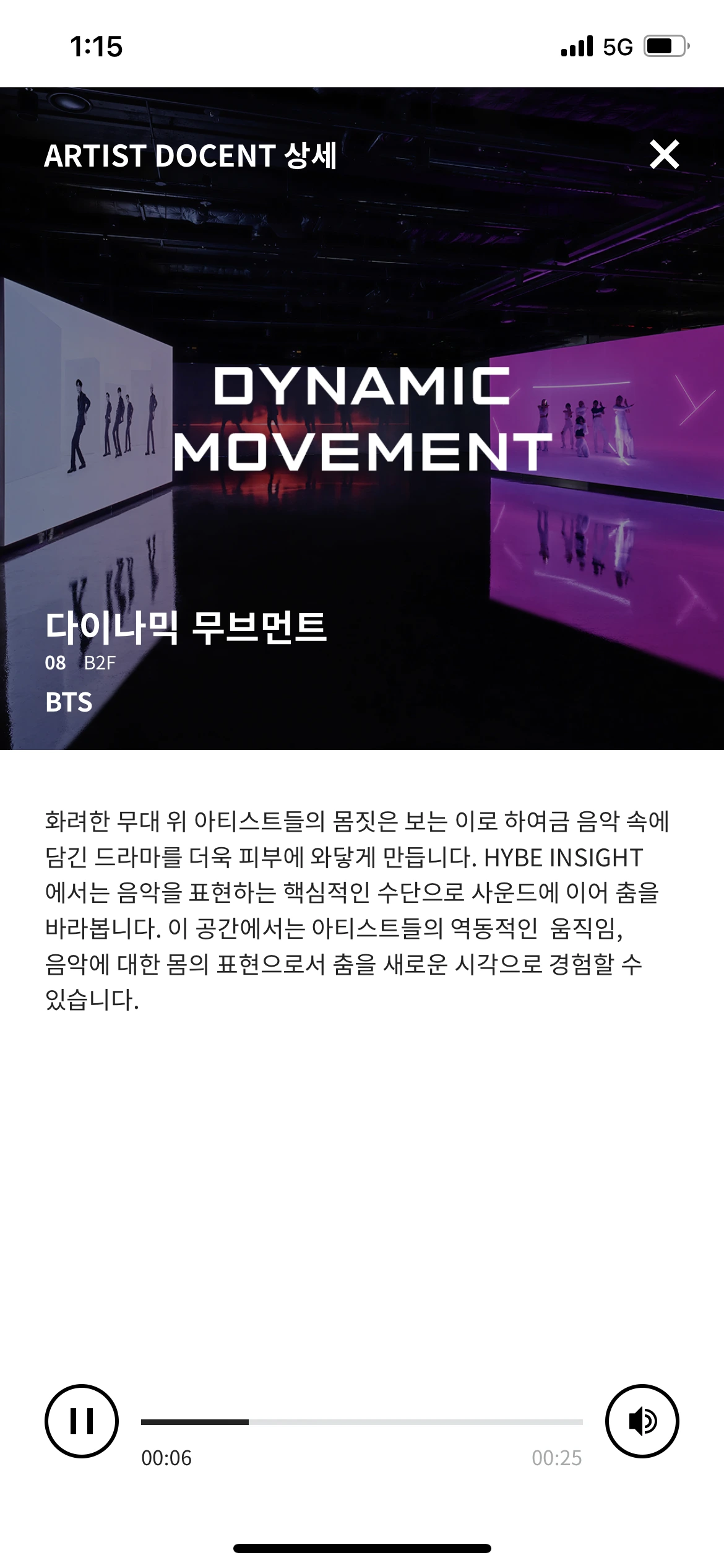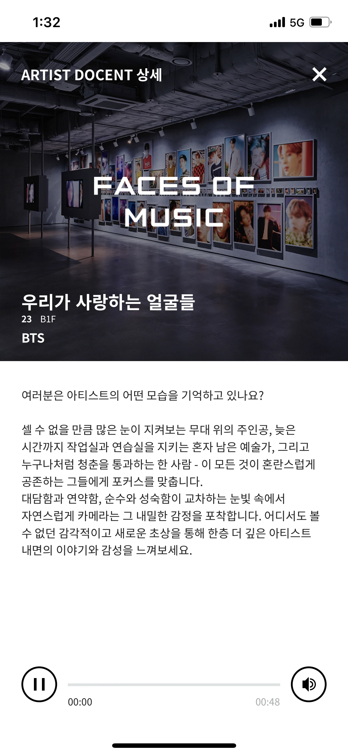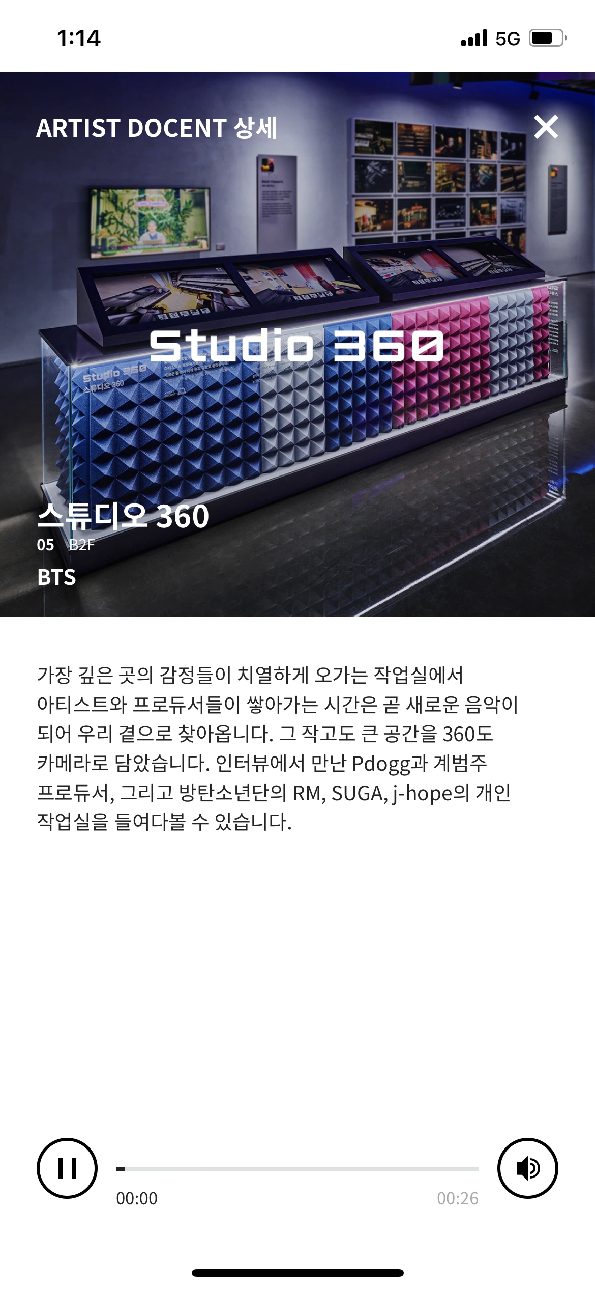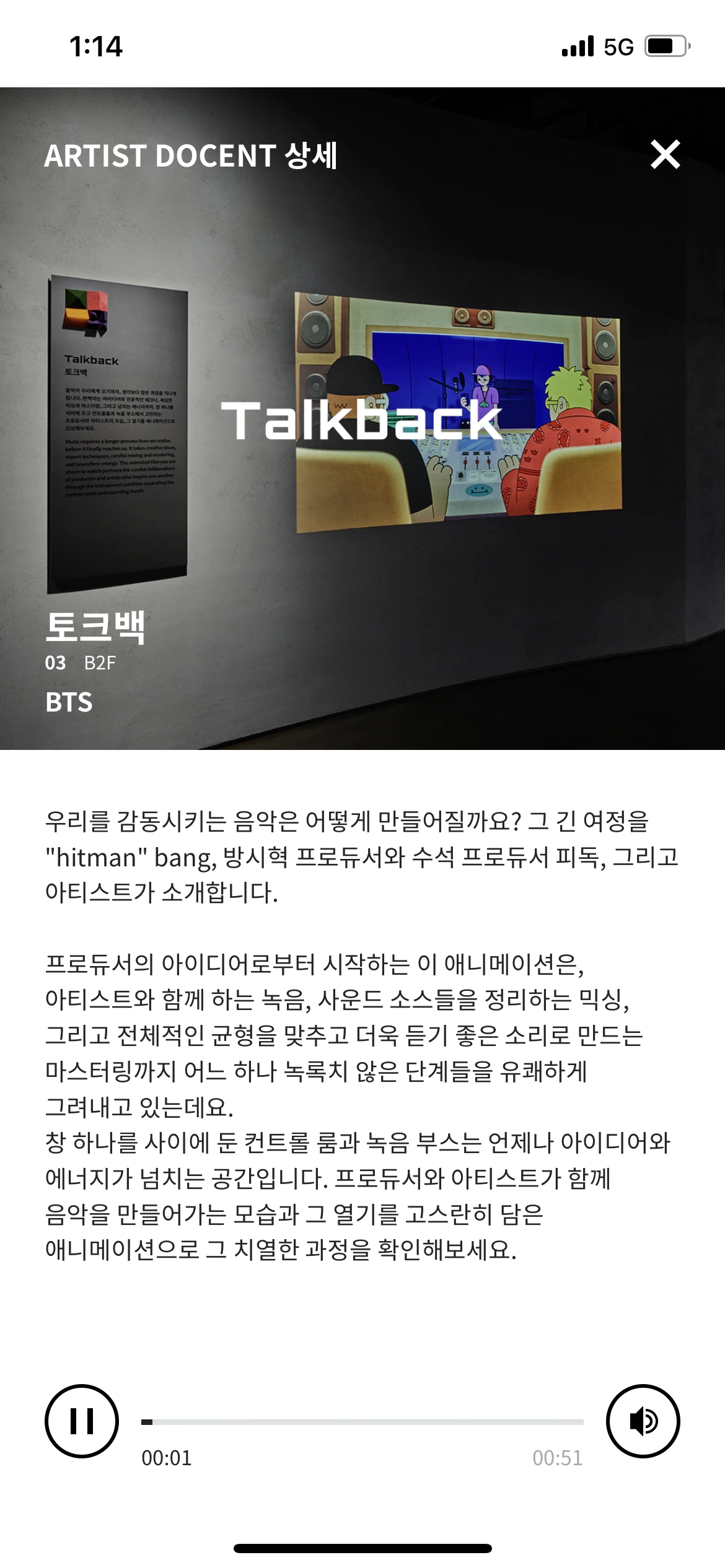 2021년 하이브 오프라인 전시를 예약하는 모바일 화면 캡쳐 입니다. 예약 내역을 관리하고 기념 카드에 인쇄할 이름을 등록하며, 현장에서는 QR코드를 스캔하려 입장합니다. 전시장에서는 아티스트를 선택하여 도슨트 서비스를 할 수 있습니다.