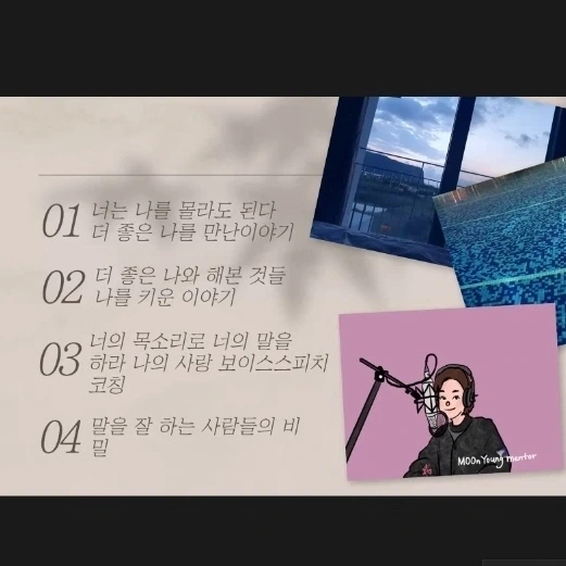 오늘 이야기할 네 가지 주제를 말씀드릴께요. 첫째는 '너는 나를 이제 몰라도 된다 더 좋은 나를 만난 이야기' 둘째는 '더 좋은 나와 해 본 것들, 나를 키워낸 이야기' 세 번째는 '나의 사랑 나의 보이스&스피치 코칭을 하는 이유'