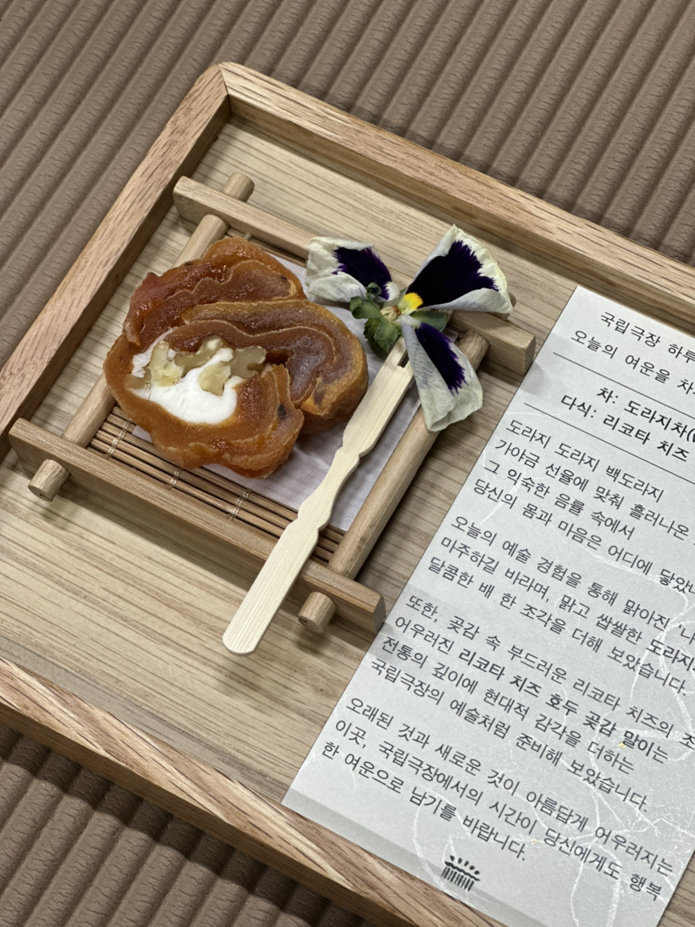 이날의 융숭한 대접은 여기서 끝이 아니었다. 가야금이 흐르는 사바사나(누워서 온몸을 이완시키는 요가 동작)로 수련을 마무리하고 일어나니 정갈한 다과상이 차려졌다. 말린 배 한 조각이 곱게 띄워진 향기로운 '도라지차'와 예쁜 꽃을 곁들인 '리코타 치즈 호두 곶감 말이'. 따끈한 도라지차가 어찌나 구수하고 맛있던지 연거푸 세 잔이나 마시고 말았다.
