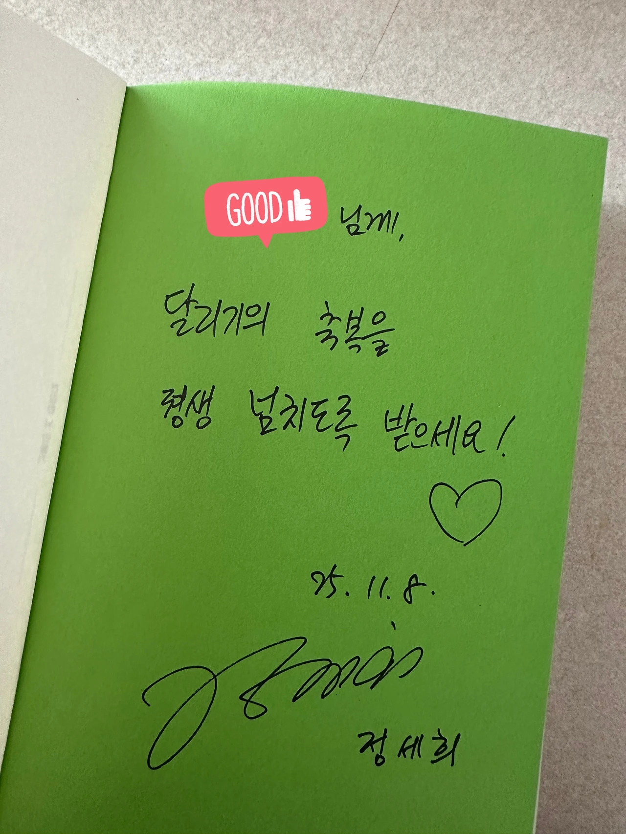 정세희 교수님이 사인과 함께 적어주신 메세지입니다. 달리기 대선배님의 진심어린 응원에 힘입어 ‘겨울 달리기의 축복’을 넘치도록 받을 용기를 내볼까 합니다. 게다가 겨울 달리기 후 돌봄과 치유의 음식으로 뜨끈한 순대국과 진한 라떼까지 추천해 주셨으니 더이상 안 뛰고 고민만 계속할 이유가 없을 것 같네요. 얇은 옷 겹겹이 껴입고, 모자와 넥워머, 장갑으로 중무장하고는 찬바람 부는 천변으로 달려나가 보렵니다.