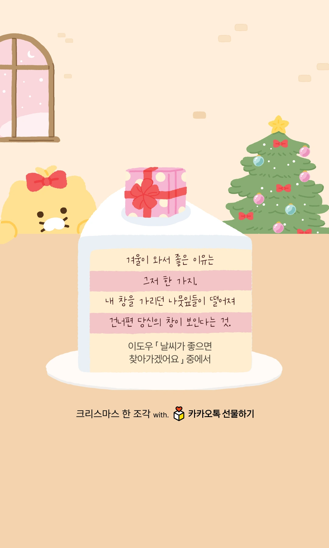 오늘, 크리스마스이브의 설렘 속에서 사랑하는 사람에게 “카톡!” 하고 다정한 인삿말을 건네 보는 건 어떨까요? 선물 아닌 마음이 담긴 인삿말 만으로도 충분히 따뜻한 오늘이 될거에요.